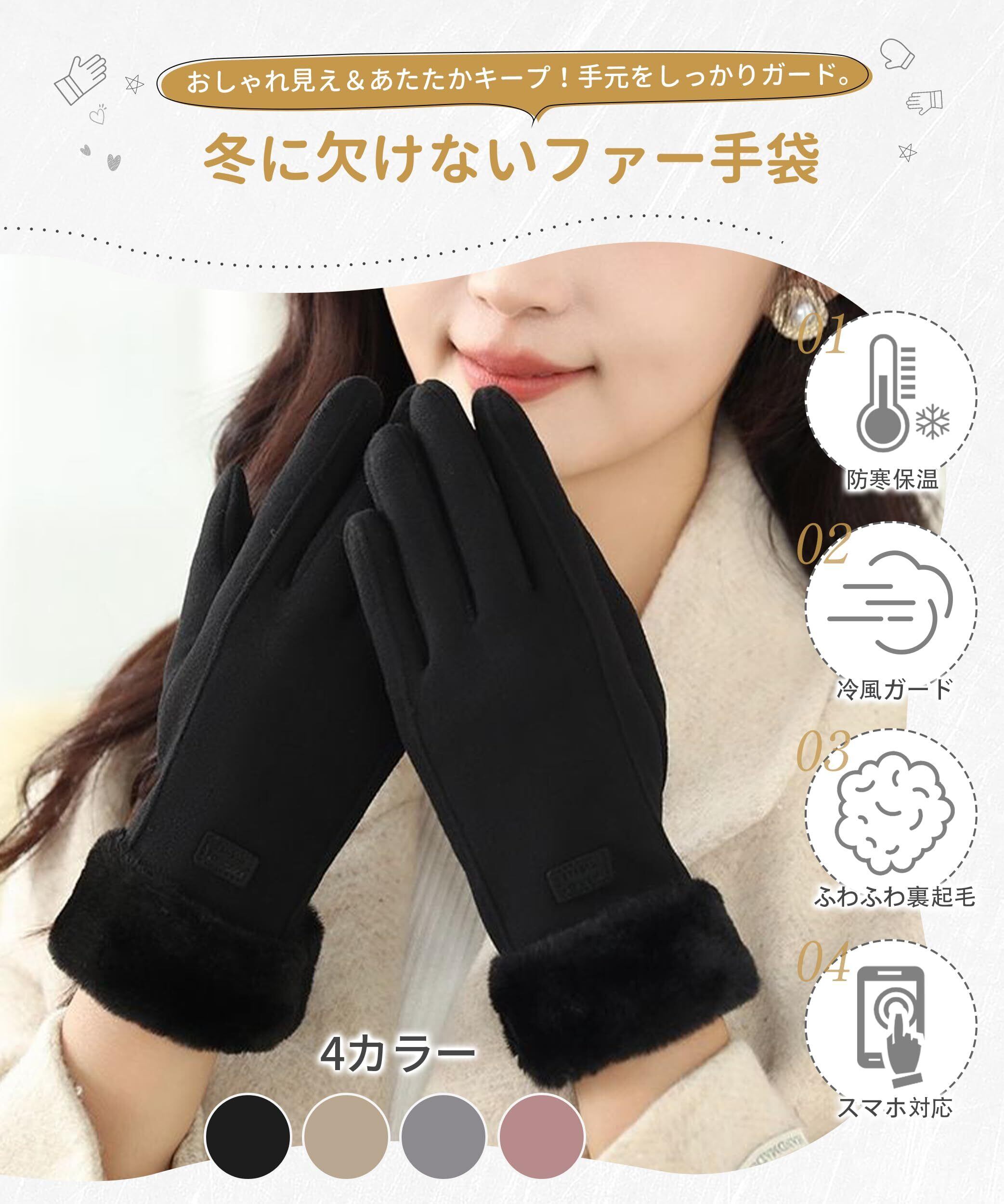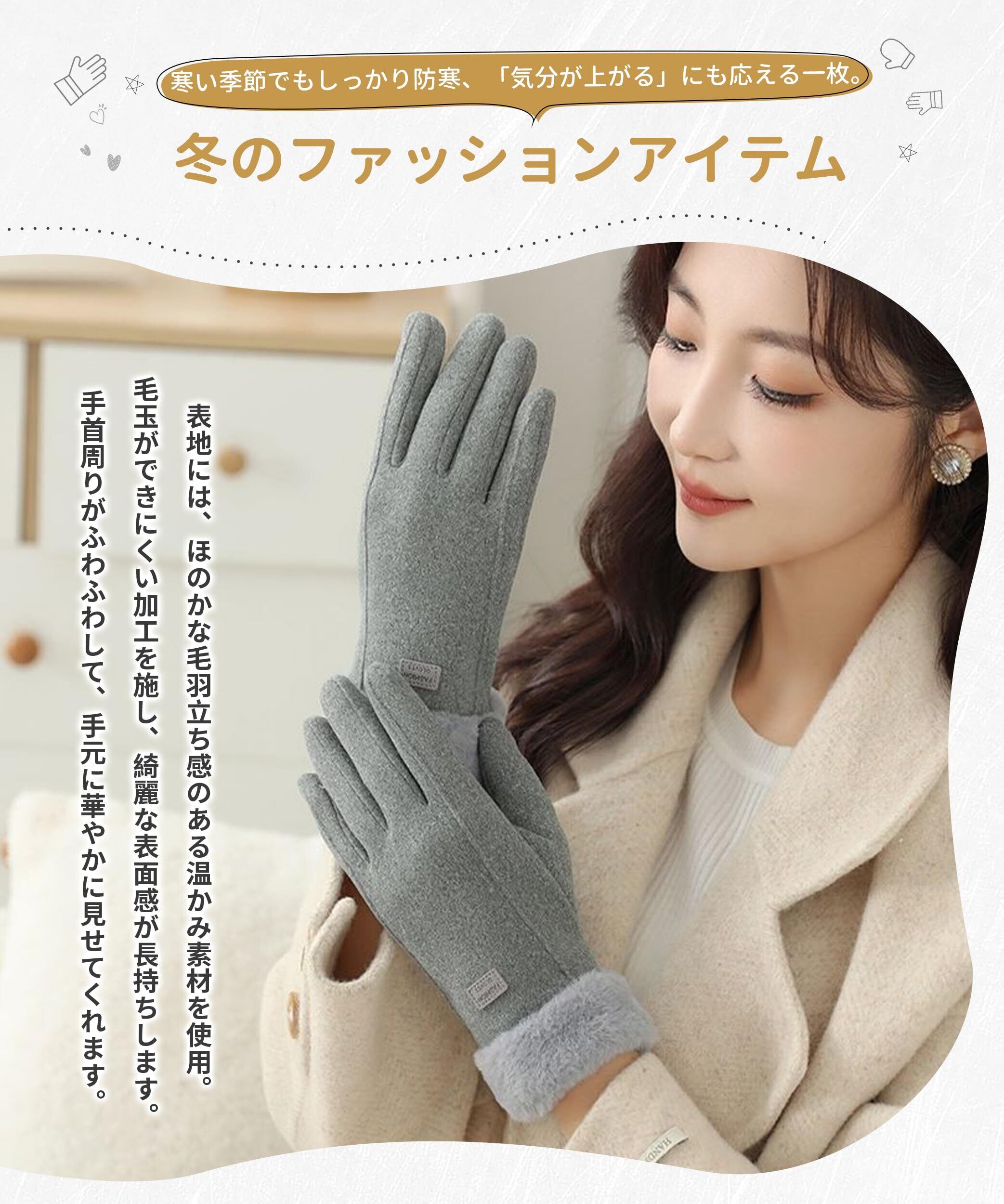 【手元が暖かいファー手袋】指先から手首までしっかり暖める手袋 レディース。内側にはふわふわした裏起毛素材を使用し、着けた瞬間から温かさをお届けします。このレディース手袋の手首周りにもファーが付き、見た目も上品に冷風シャットアウト。高い保温性で、寒い朝の自転車通勤やお出かけでも手をしっかり守ります。