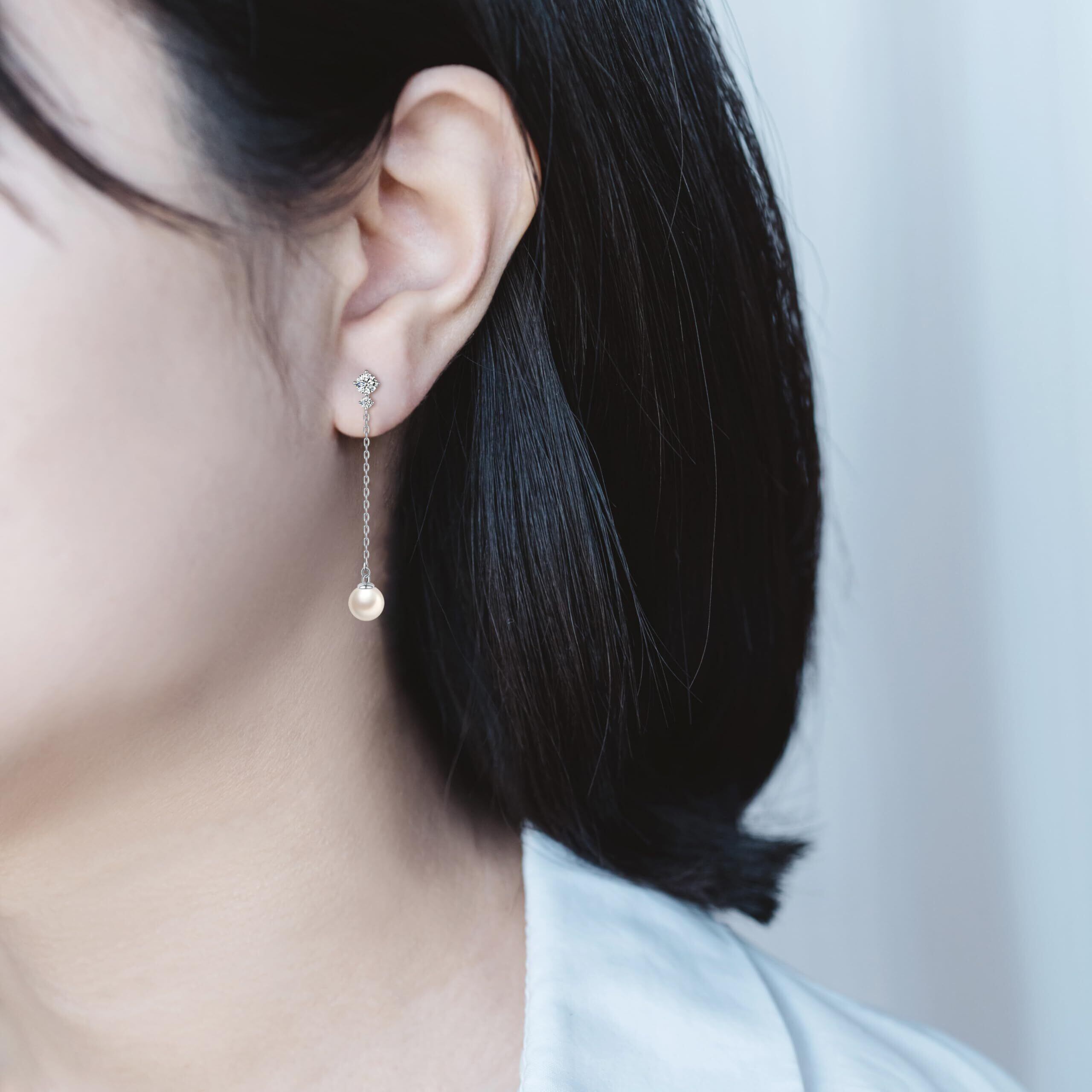 白い真珠:光の屈折で、丸みを帯びた小さい真珠がゆらゆらと揺れ、柔らかな光沢を放ち、ピアスをより洗練された、存在感あふれるものに見せる