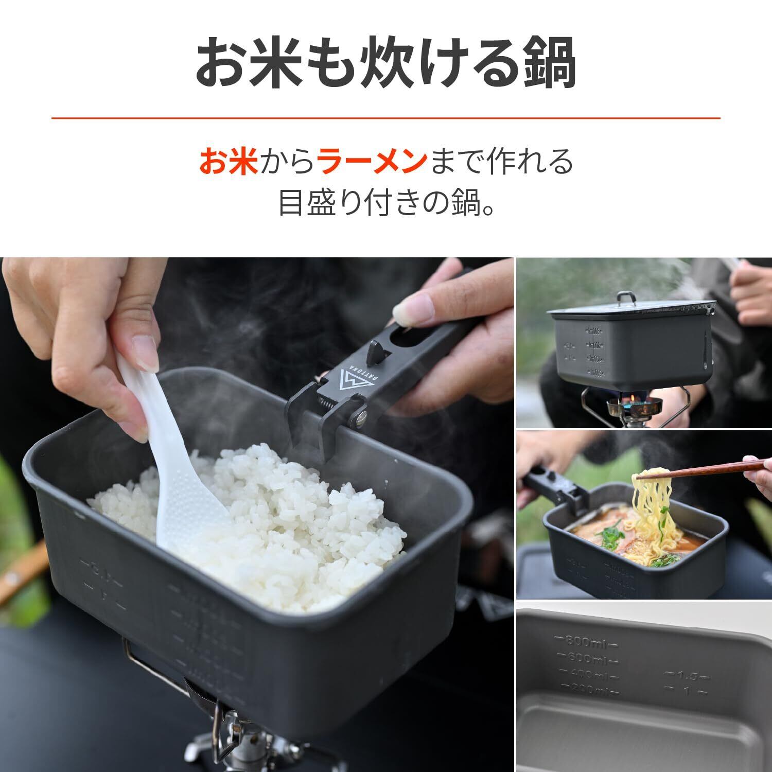鍋には容量と炊飯に便利な目盛り付きで、アウトドアでの調理をより快適にサポートします。