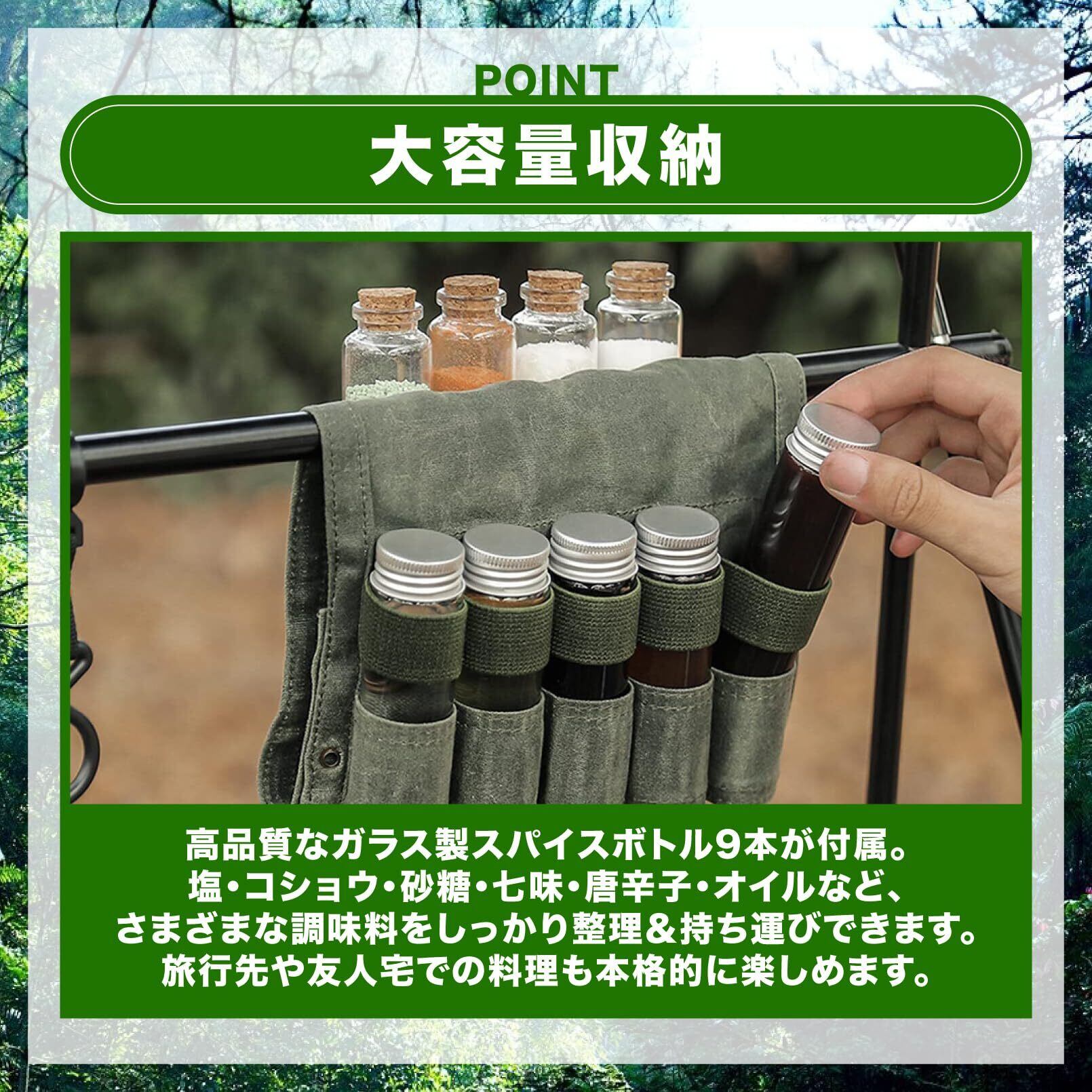 スパイス収納ポーチ キャンプ アウトドア用 9本収納 調味料ケース BBQ (グリーン)