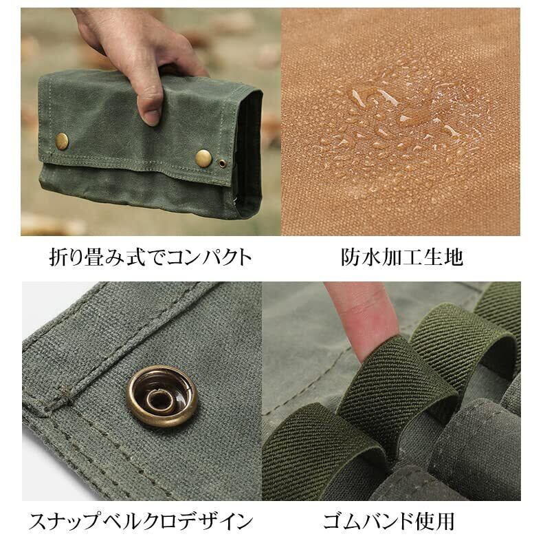特徴:軽量コンパクトでありながら、収納量と使いやすさを重視。ブッシュクラフトなどソロキャンプに適したデザイン ・水や油汚れなども気にせず収納 ・使い込めば使い込むほど風合いが楽しめる ・シンプルで飽きのこないデザイン ※ 優れた撥水性を持ちます。はじめは硬くゴワゴワした手触りですが、使い込んで頂く程に、独特の風合いとチョークマークによる色合いの変化を楽しめます。