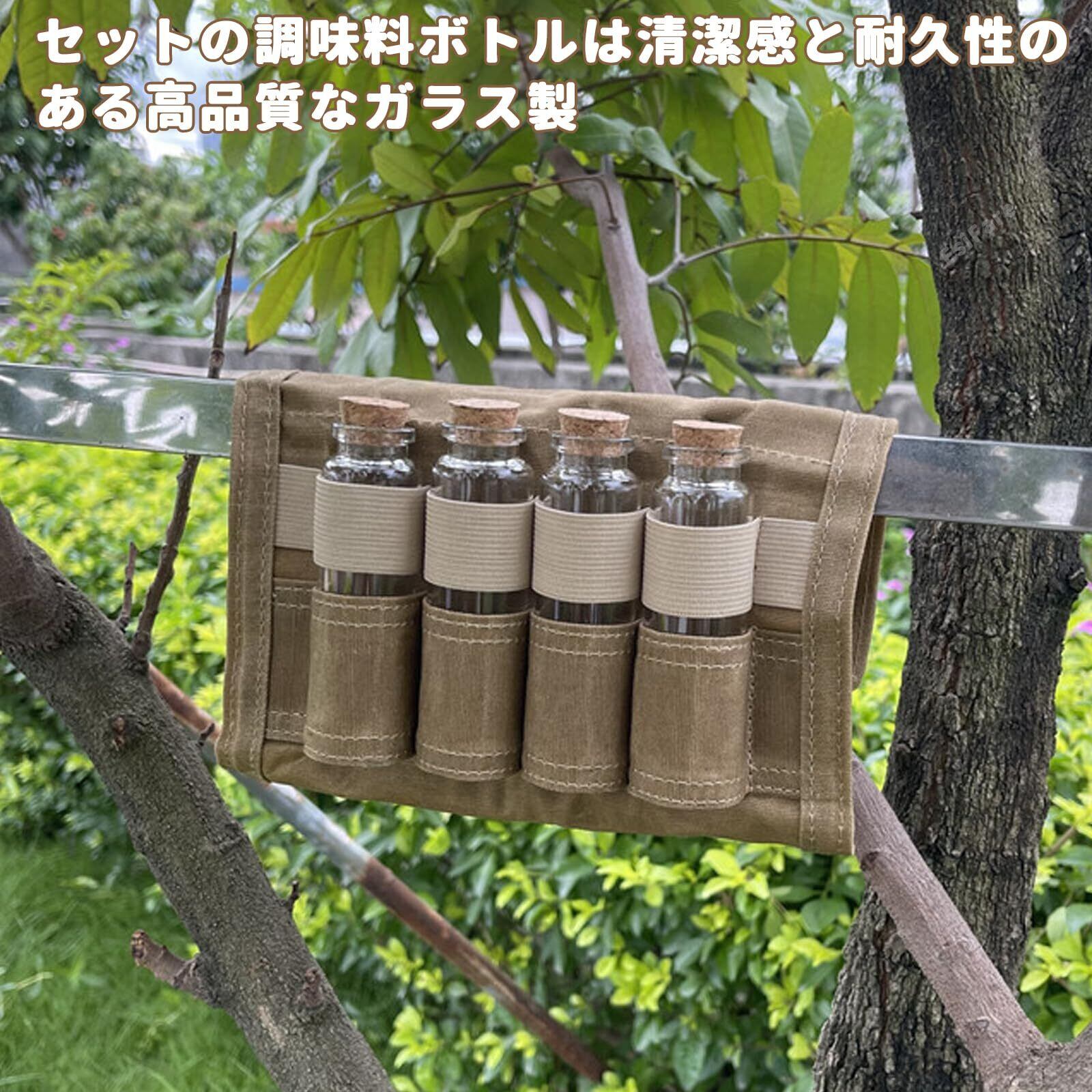 【大容量&機能的な収納】この調味料ボトルとと収納バッグのセットには、木栓タイプとキャップタイプの調味料ボトル計9本が付属、塩、胡椒、七味、砂糖、オイル、唐辛子など、さまざまなスパイスを美しく整理して持ち運べます。キャンプ料理の幅がぐっと広がります。