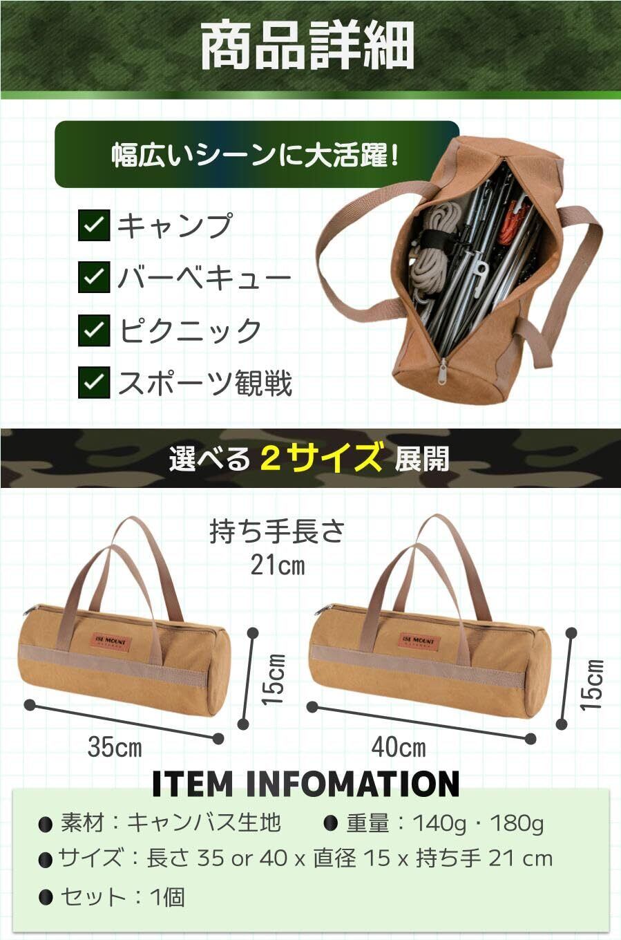 【商品詳細】素材:キャンバス生地重量:140g・180g/サイズ:長さ 35 or 40 x 直径 15 x 持ち手 21 cm /セット:1個/