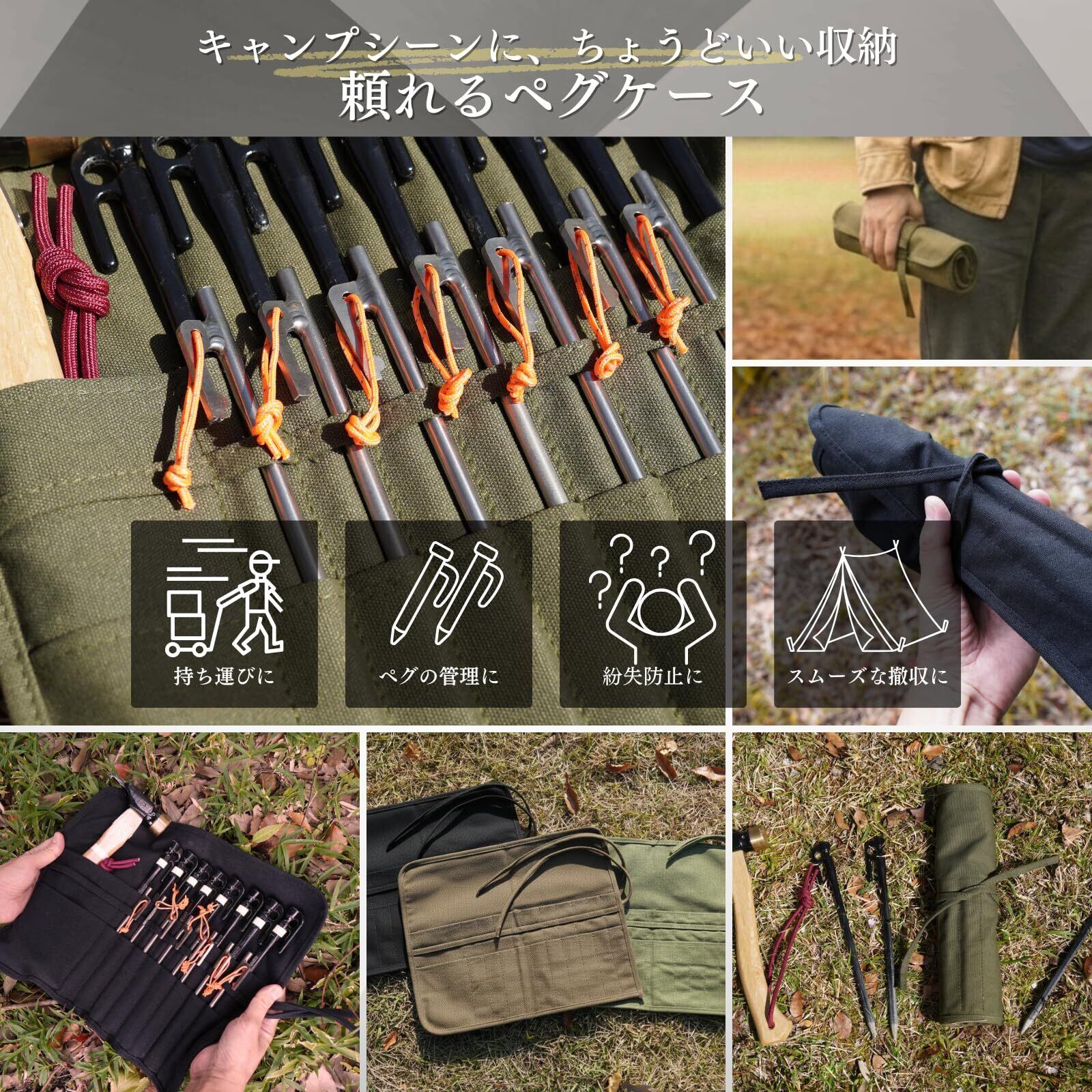 ペグを1本ずつ収納できる。帆布製ペグロールケースです。大切なペグの紛失防止に繋がります。