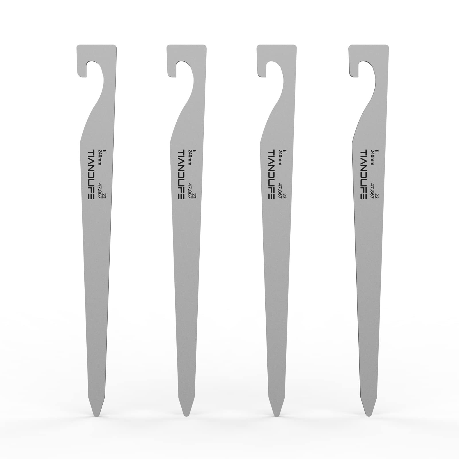 【TIANDLIFE 一体成形 純チタンペグ】サイズ:240mm*26mm*3mm・素材:98.8%純チタン・重さ:49.5g/1本。溶接なし、ワンピース成形。 壊れにくく、より大きな圧力に耐えることができます。 収納もとても簡単で、水で洗うだけできれいになります。