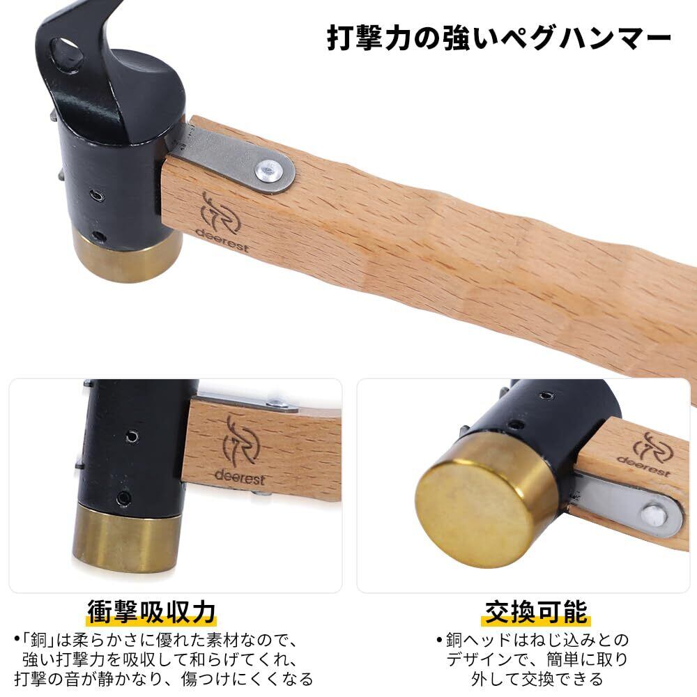 【2022最新】deerest金属製ペグハンマー銅ヘッド滑り止め木製ハンドル鉄製本体ペグ打ちフック型ペグ抜きテント&タープ設営撤収ツールキャンプアウトドアギア道具