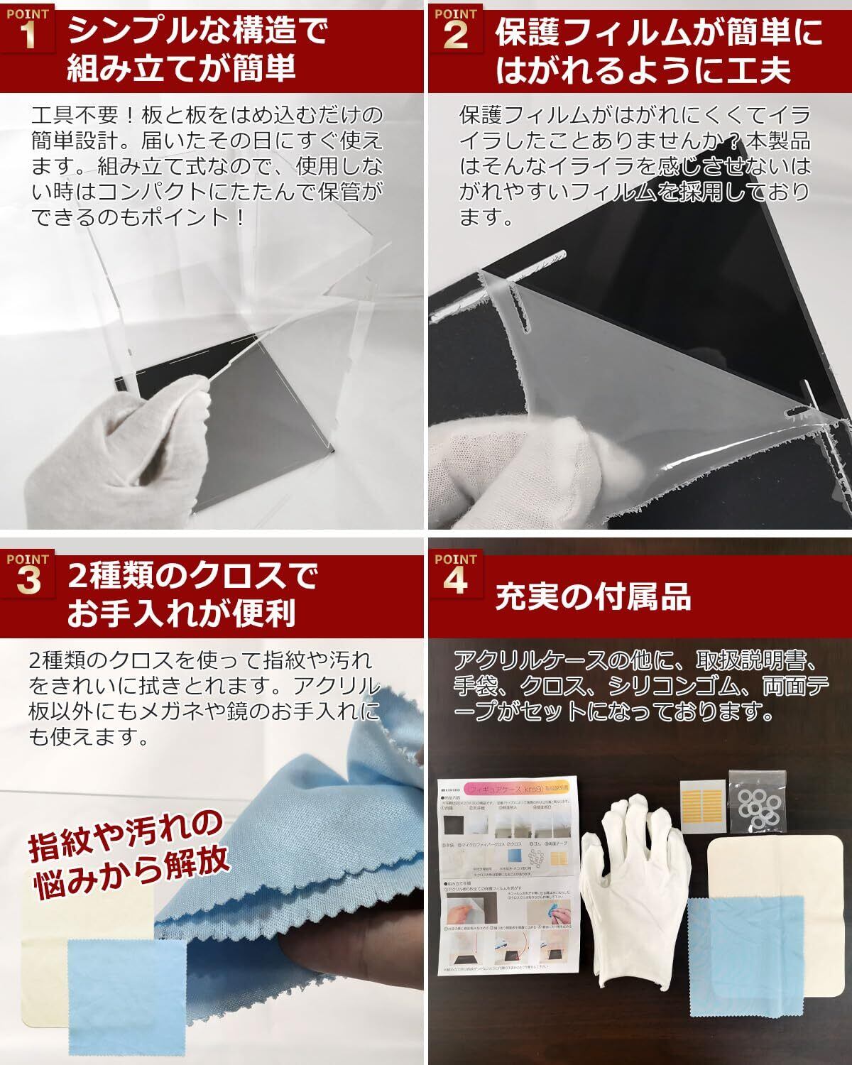 【素材】高品質アクリル製 透過率93.3% クリアな視界を確保しながら、ホコリや汚れから大切なアイテムを保護します。