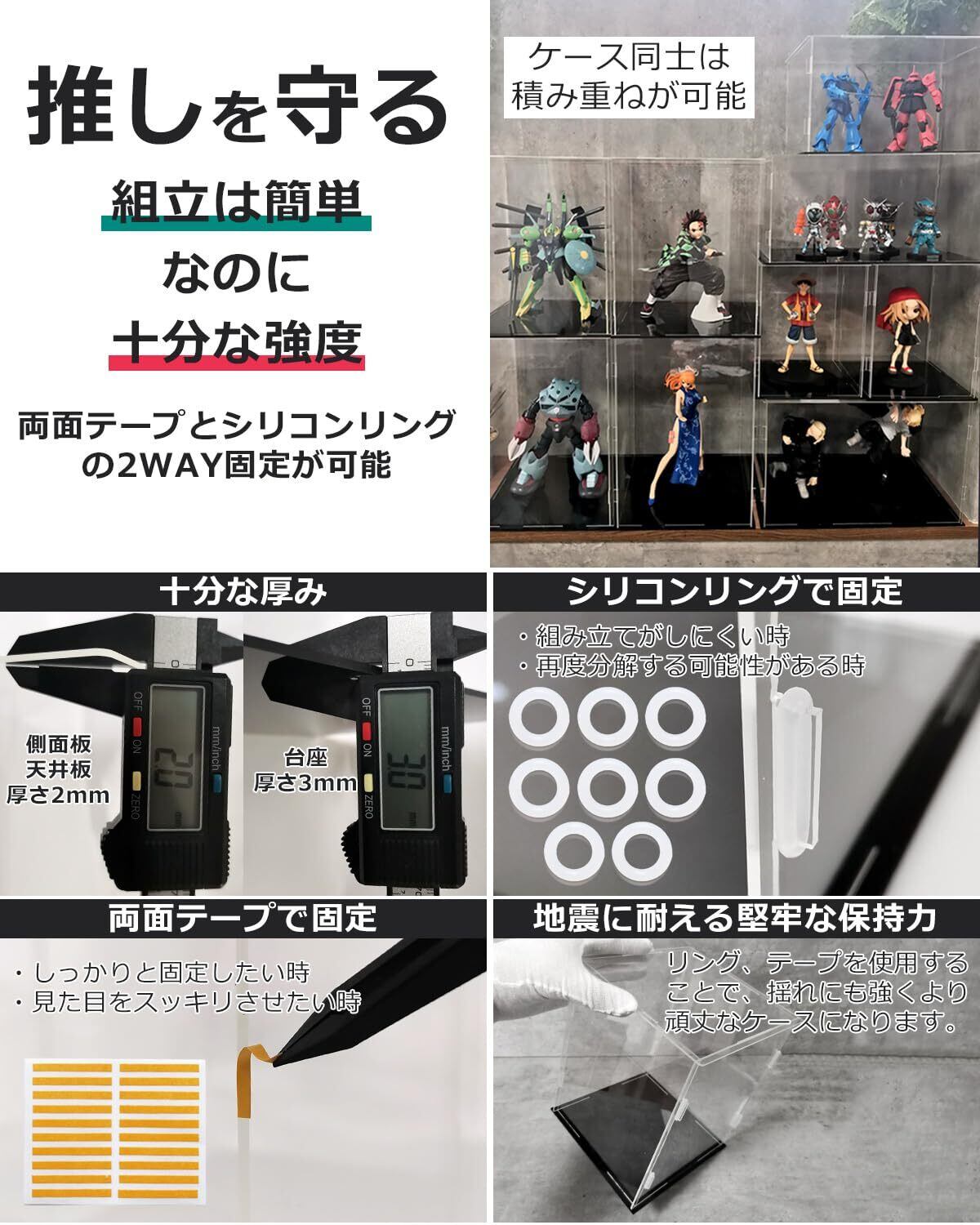 【スペック】天井・壁面4面は透明アクリル製:2㎜厚 台座は黒色アクリル製:3㎜厚 ・積み重ね時の耐荷重約5㎏・ 固定は画期的な両面テープとシリコンゴムの2WAY方式。スッキリ見せたい場合は両面テープを、組み立てやすく分解しやすさを重視する場合はシリコンゴムをご使用下さい。 しっかり固定したい場合は併用も可能です。