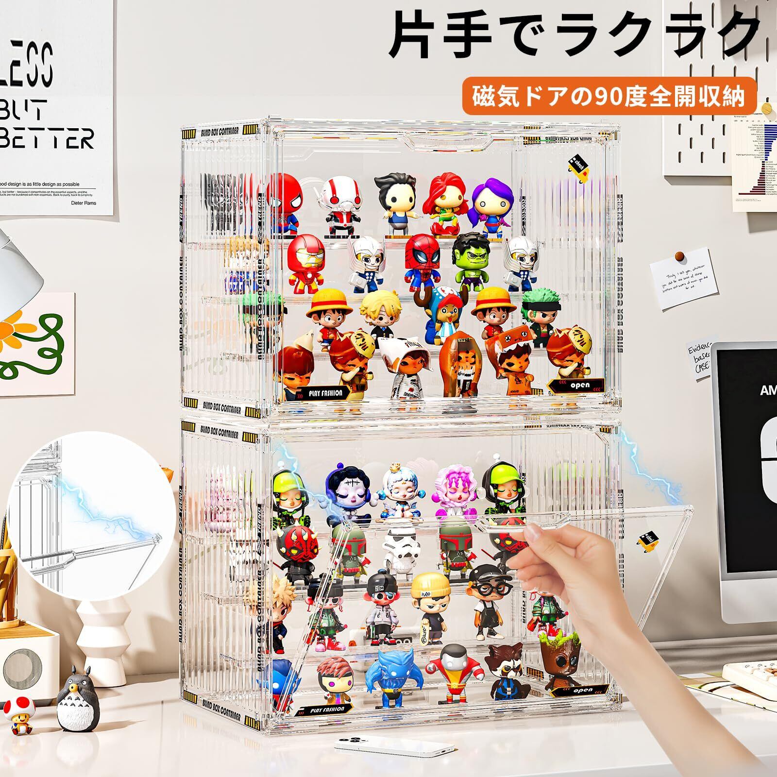 【便利な設計】棚板はお気に入りのフィギュアサイズに合わせて自由に配置可能。マグネット式のドアは片手でパカッと開くので、よく触るアイテムの出し入れもらくらくです。コレクションが増えても大丈夫!安定して積み重ねられるので、展示スペースを縦に有効活用できます。最後の一つまで、便利さにこだわりました