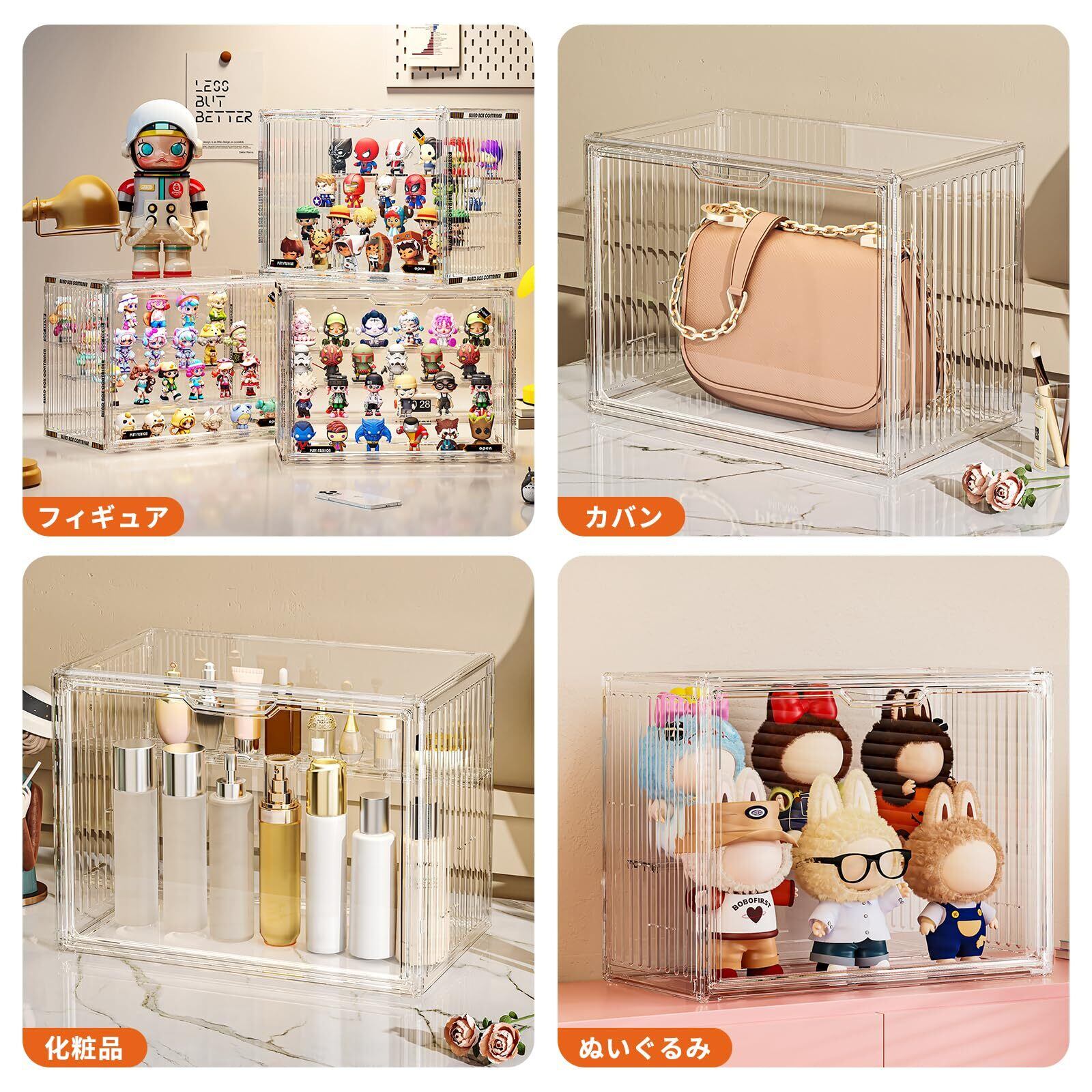 【広範な応用】フィギュアや人形、コレクション収納、模型、推し活グッズ、本、靴、バッグなど、様々なアイテムを整理可能。寝室・デスク周り・展示会・キッチン・オフィスなど、ショーケースの使用場所を選ばず活躍します