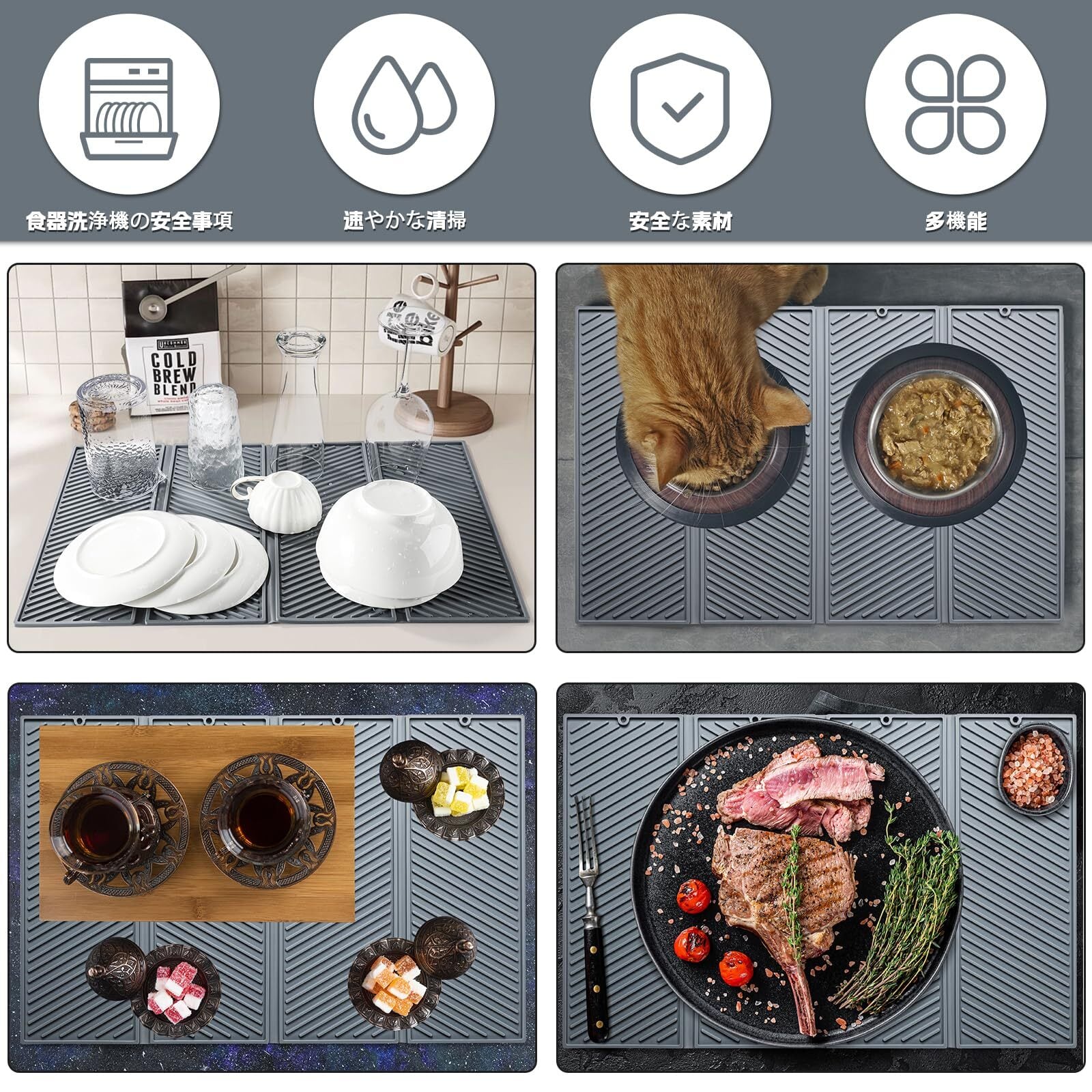 シリコン製水切りマット:このシリコン食器乾燥マットはシリコン素材を使用しており、サイズは約 60cm×45cmです。洗い上げた食器やグラス、鍋、フライパンなどを自然乾燥させるための便利なスペースを提供し、カウンタートップを乾燥かつ清潔に保ちます。