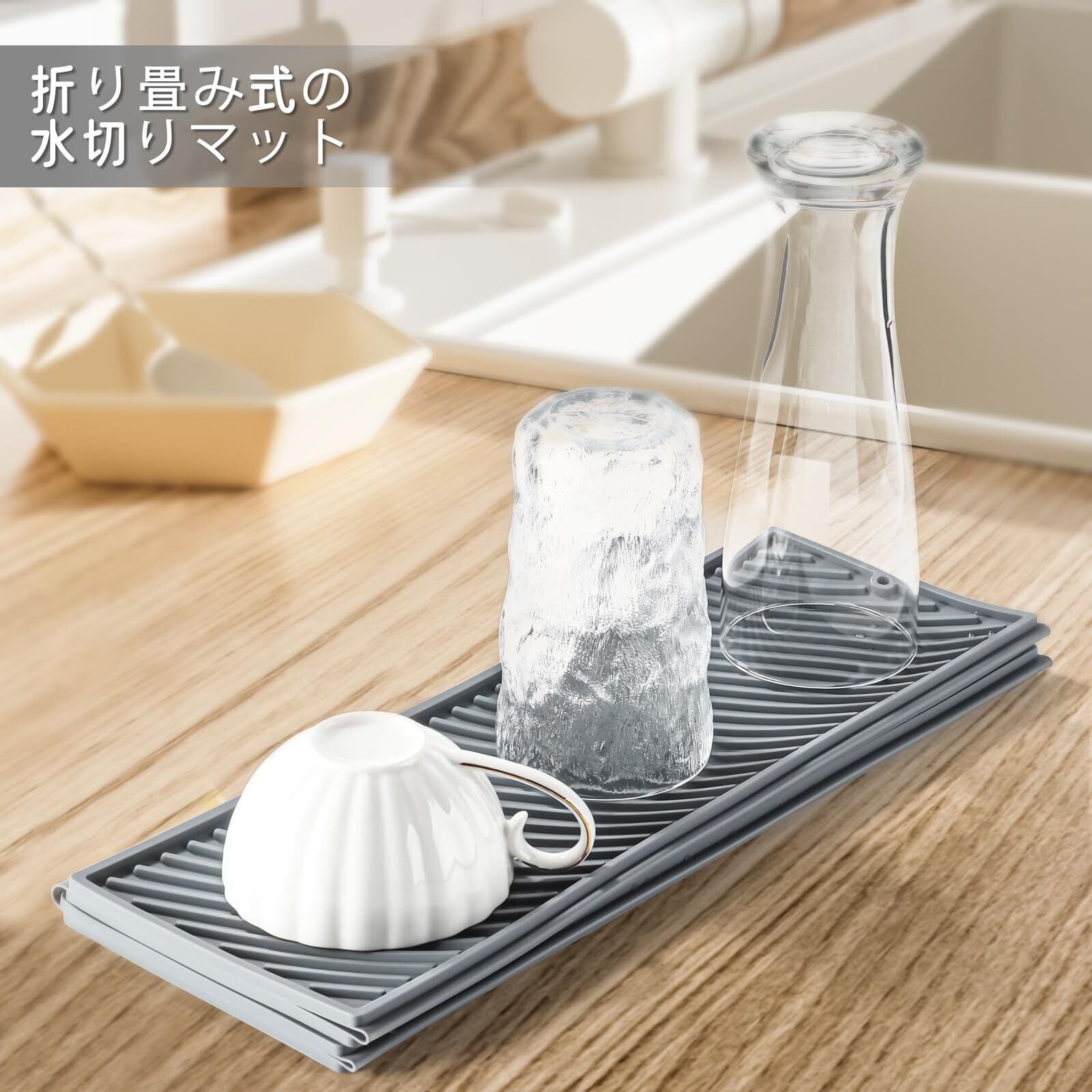 【在庫処分】水切りマット 折りたたみ シリコン製シンクマット 滑り止め 58cm×38cm 吸水 食器 鍋 コップ乾燥用 壁掛け可能 キッチン用 グレー (グレー, 58*38)