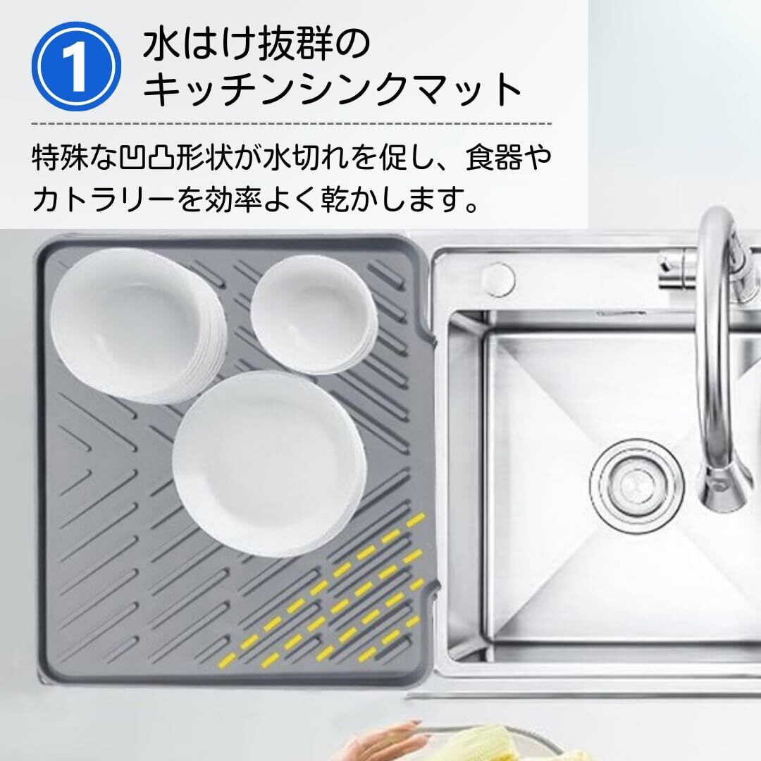 【清潔さをキープできるシンクマット】立体的な凹凸が通気を促し、食器類がすぐに乾きます。さらに傾斜と排水路で水滴をシンクに流し、カウンターの水ジミも防止できます。