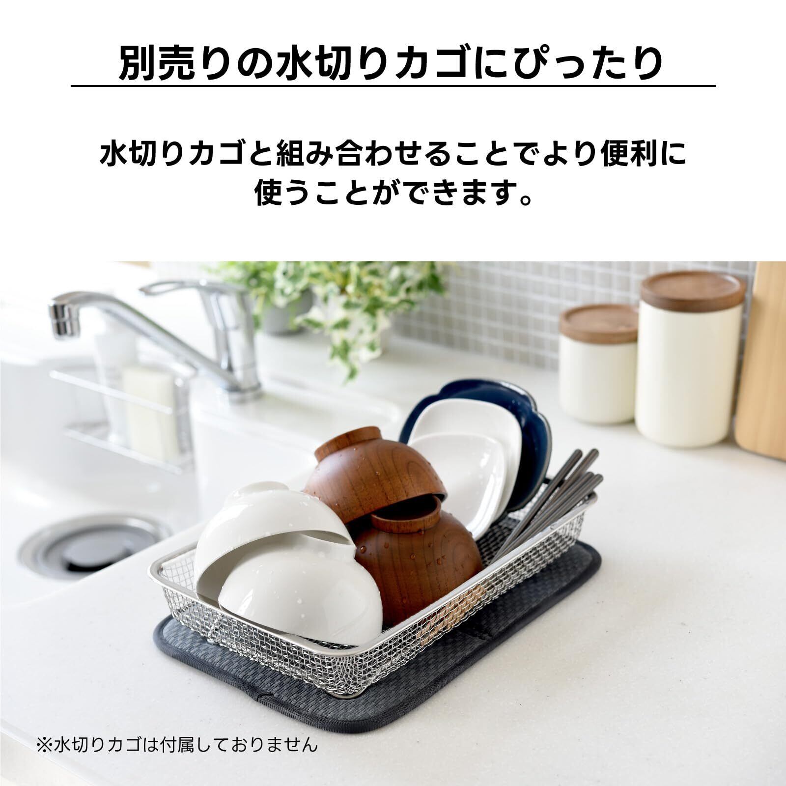 「逸品物創 シンクを広く使える水切りカゴ A-78074」とピッタリサイズなので、水切りカゴの下にセットする事でシンク上を水滴で濡らすことがない