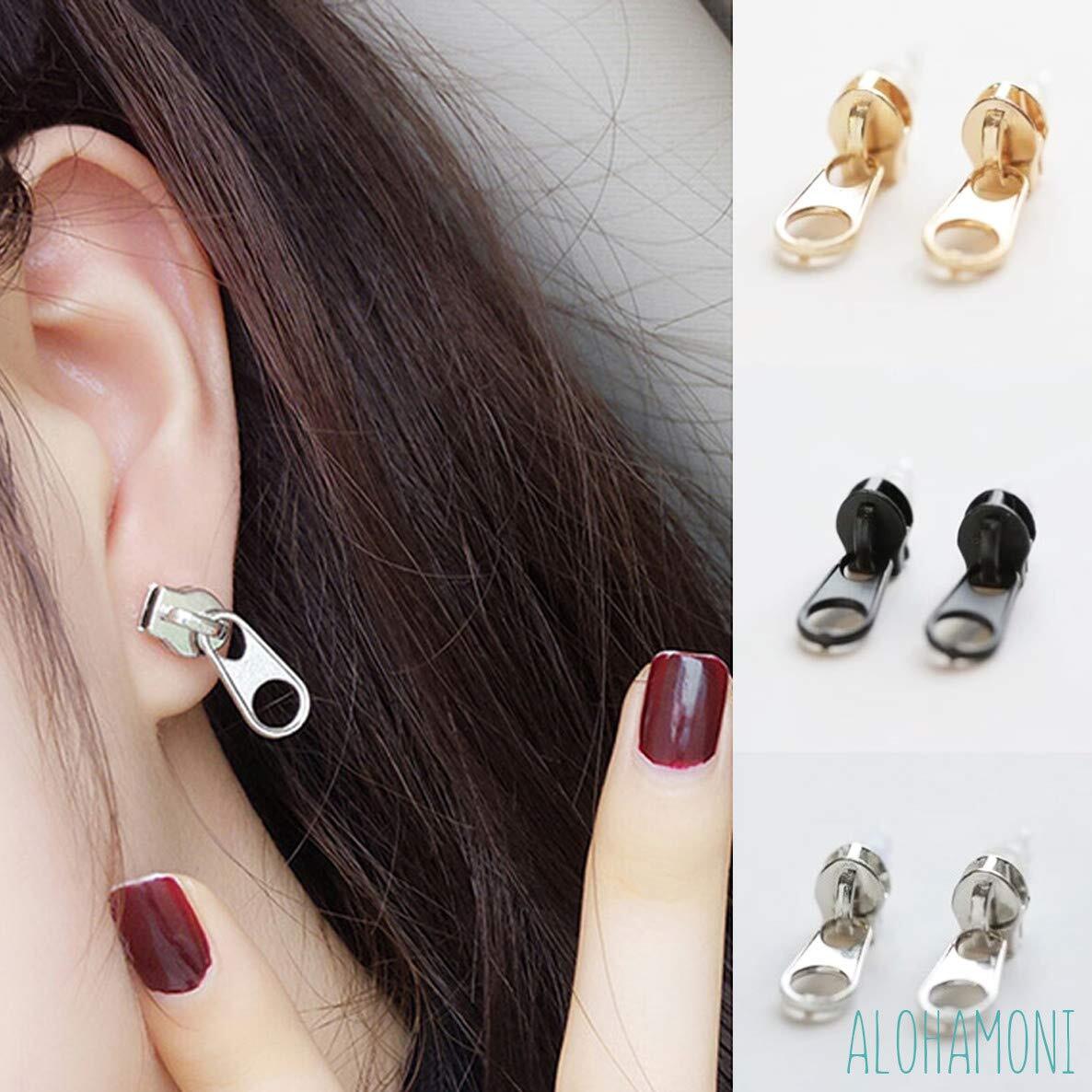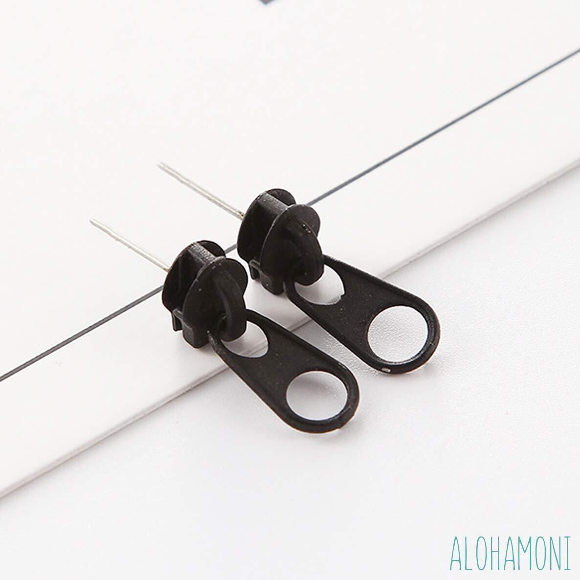 ALOHAMONI (アロハモニ) ファスナーピアス フェイク チャック ジッパー スタッド ピアス ヴィンテージ レトロ アンティーク 両耳 2個セット ステンレス シルバー レディース メンズ ユニセックス 韓国 オルチャン (ブラック)