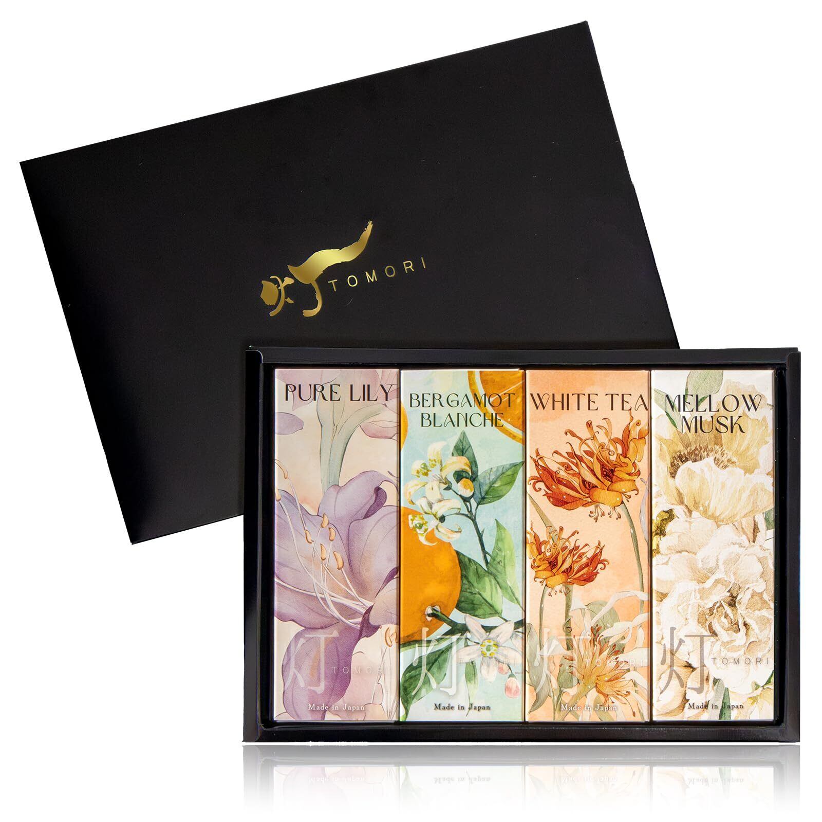 【4つの香りで日常に華やぎを】透明感あふれる「ピュアリリー」、甘く上品な「メロームスク」、陽だまりのようにやさしい「ホワイトティー」、清らかで爽やかな「ベルガモット」。それぞれ個性豊かな香りを気分やシーンに合わせて楽しめるアソートタイプ。お香初心者から香り好きの方まで幅広くお楽しみいただけます。