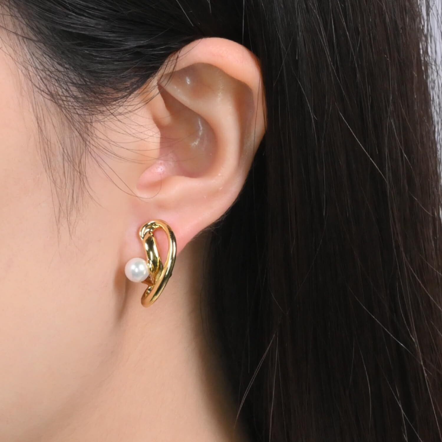 リボンと パール :このイヤリングは、クラシックで華やかなゴールドのトーンと柔らかくねじれたリボン状のラインが、真珠の尊厳と優雅さを引き立てています。直径5ミリの小粒真珠は、派手すぎず、控えめな優雅さをたたえています