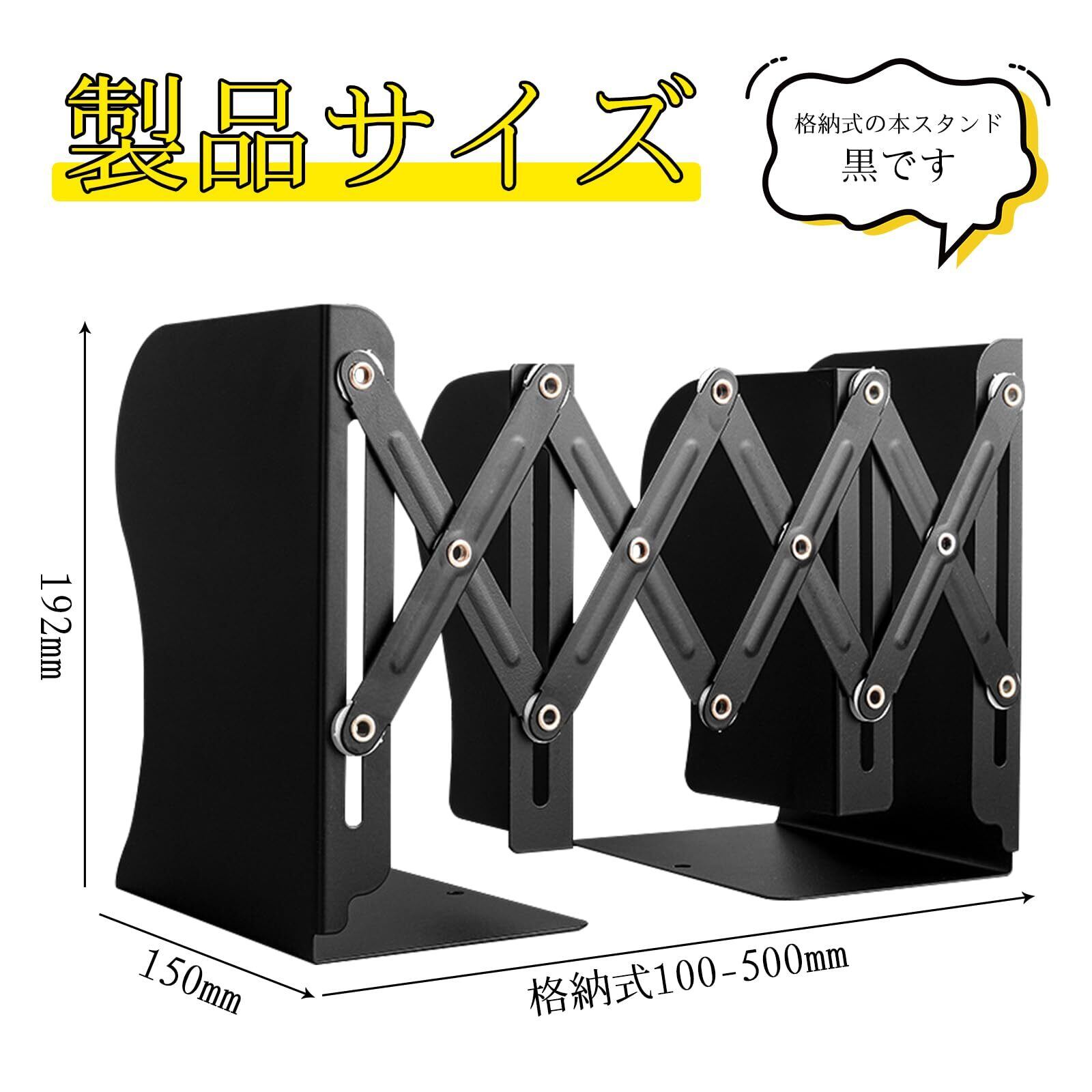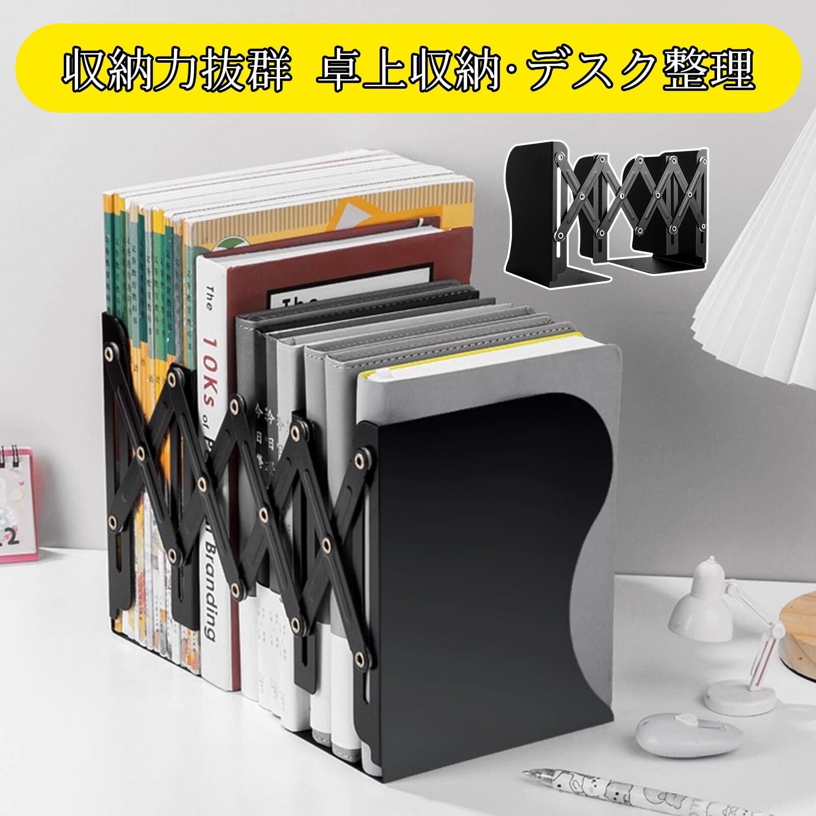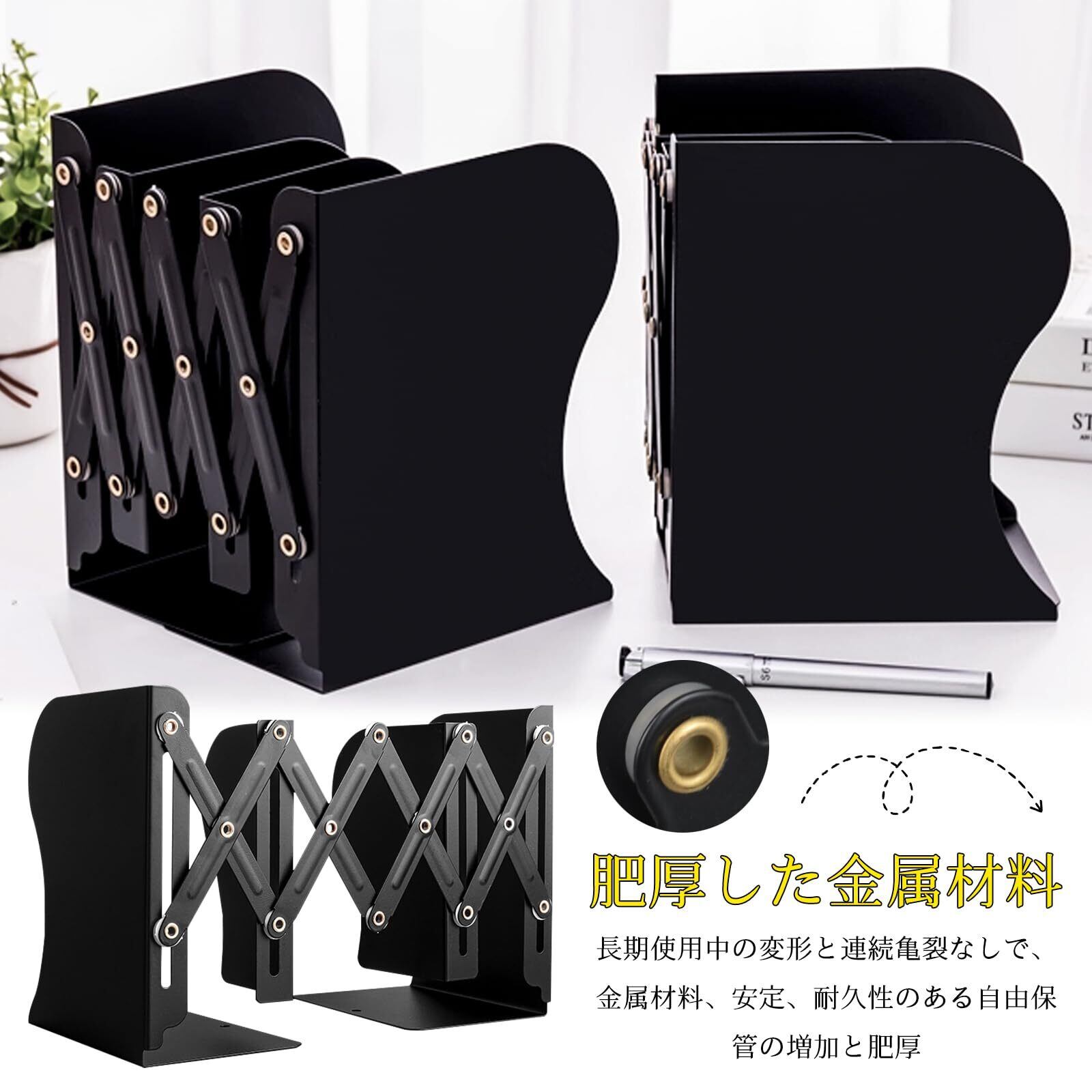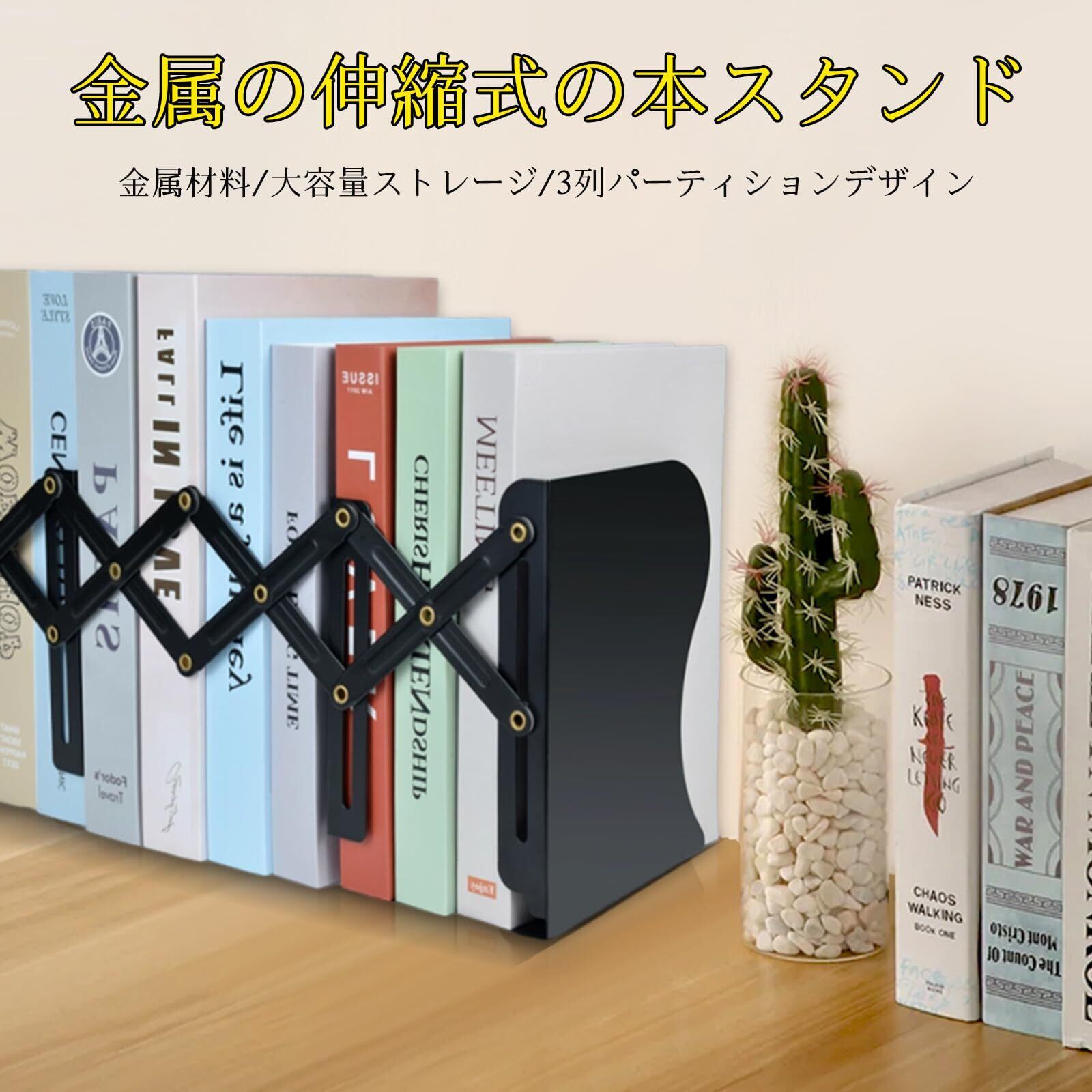 本立て 倒れない ブックエンド 3連 ブックスタンド 伸縮 デスク 本の整理 仕切りブックスタンド 卓上本棚 金属製 (黒)