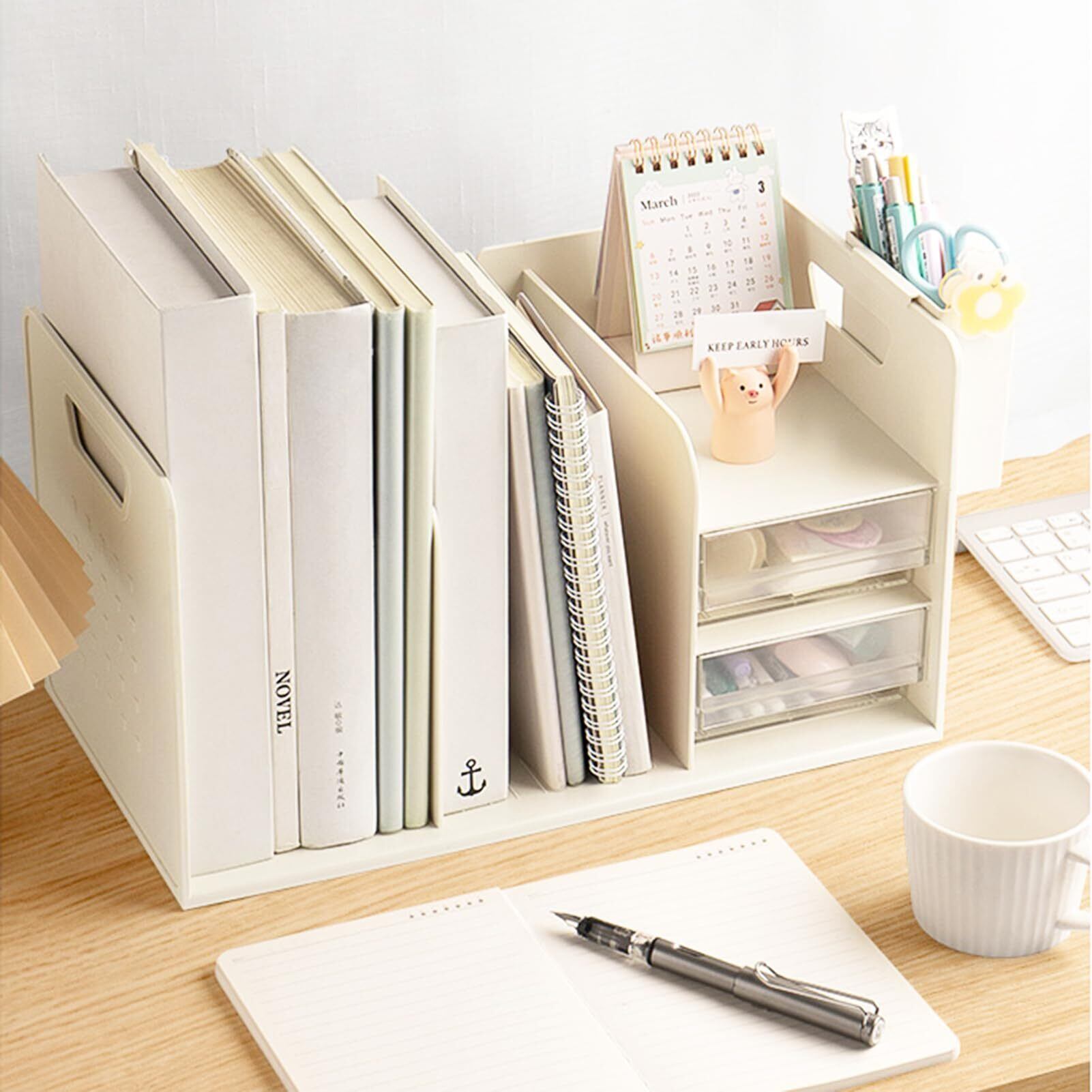 ELECTRO-WEIDEWORLD 卓上収納 組み立て不要 デスク上置き棚 ペン立て付き 引き出し 大容量 デスク 整理 卓上ラック デスクオーガナイザー 机上ラック 本立て 本棚 desk organizer A4フォルダー/新聞/雑誌/書類/事務用品/文具用品収納 分類収納 (ホワイトA-ホワイト引き出し)
