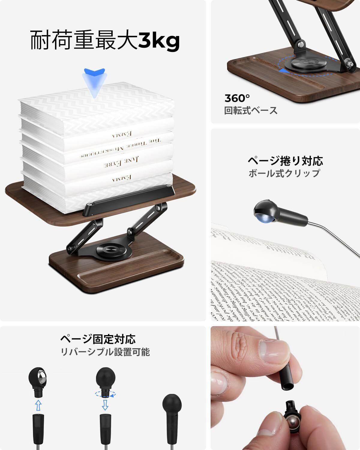 viozon 書見台 ブックスタンド 卓上 勉強 360度回転式 ペン用のくぼみ付き 無階段高さ調整 折りたたみ式 安定 おしゃれ 本立て タブレット PCスタンド ウォールナット色