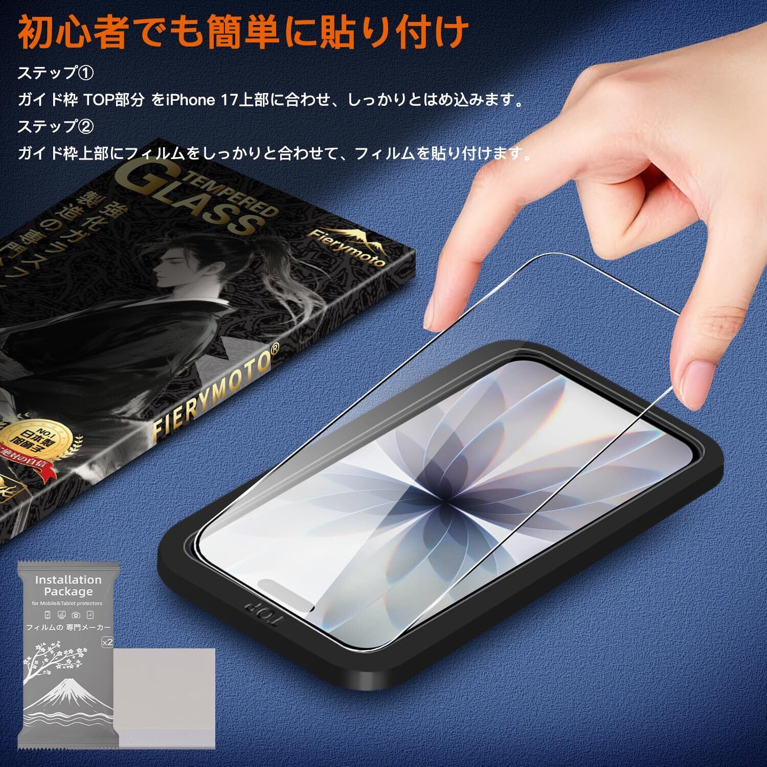 【専用ガイド枠付き・貼り付けは超簡単】対応 いphone17 強化ガラスフィルム スクリーンプロテクターに付属のマウントフレームを使用することで簡単に取り付けができ、スクリーンにしっかりと密着させるためには数ステップの簡単な作業が必要です。 また、グレードアップしたイオン自働吸着技術を採用して、初心者でもたった3ステップ、10秒で簡単に綺麗で貼り付けることができます!万が一、浮きが発生してしまった場合、布で擦って粘着させてみれば改善できます。そして、「自分で貼ると歪み、気泡、ホコリ、浮きなどの問題が起こりやすい」という常識を打ち破り、素人でも100%完璧に貼り付けます。
