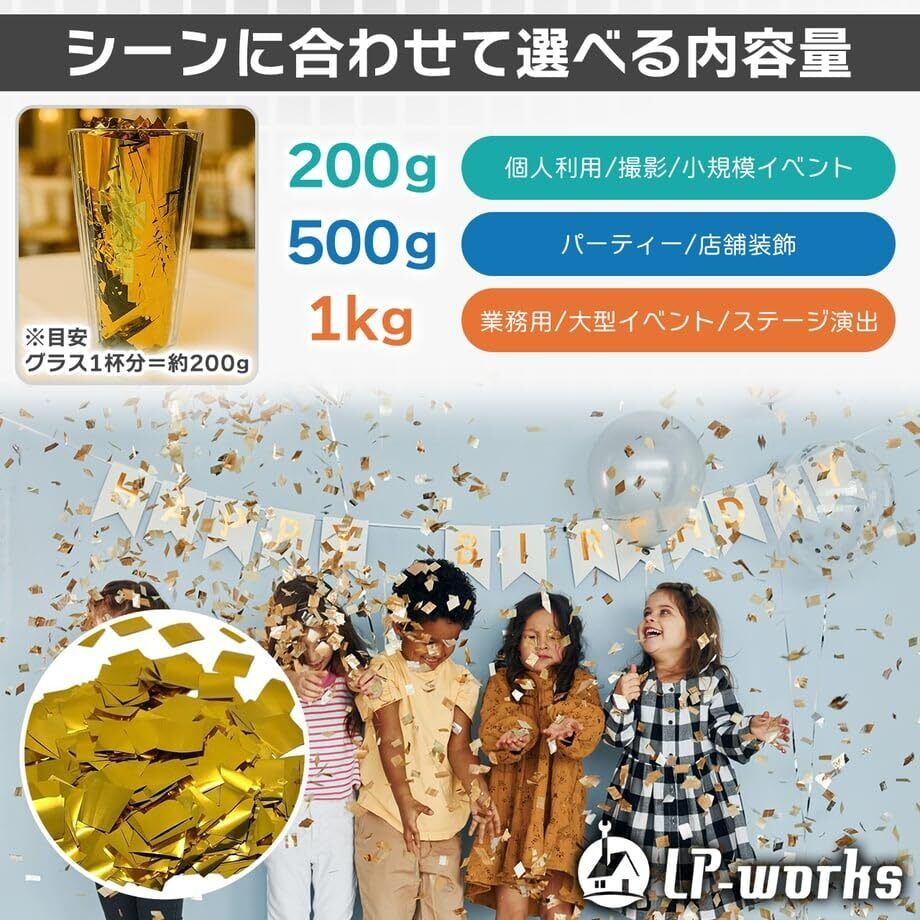 【用途】キラキラ紙吹雪は、派手で華やかな雰囲気を演出するためひ必要不可欠なアイテムです。 その魅力は、まずその色合いにあります。金色は贅沢さと高級感を象徴し、パーティー会場やイベントの装飾において特別な輝きを与えます。 ゴールドの紙吹雪が舞う様子はまるで宝石が散りばめられたような美しさで、会場全体を華やかに彩ります。 この紙吹雪は、使い勝手も抜群です。軽量で丈夫なので、持ち運びや設置が簡単で長い期間保存が可能です。