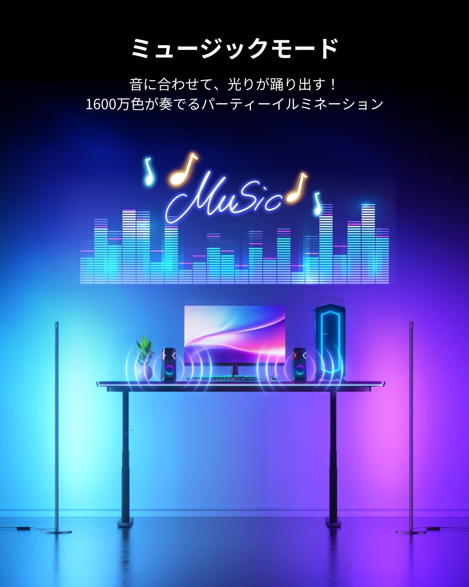 【コントロールは自由自在!家中のあかりを、あなたのスタイルで】SwitchBotフロアライトは、6つの多彩な操作方法に対応。 ①Alexa/Google Homeから、声だけで照明を調整できる「音声操作」。 ②再生中の音楽など、音に合わせて光がリズミカルに変化する「ミュージックモード」。 ③スマホを持たないお子さまや高齢者、アプリ操作が苦手な方でも簡単に使える「リモコン&有線コントローラー操作」。 ④明るさや色を細かく設定し、あなただけの光をカスタムしてシーンに登録できる「アプリ操作」。 ⑤例えば、夜10時にろうそくの灯りに近い優しい光で入眠環境を整えるなど、決まった時間に自動点灯/消灯が叶う「タイマー操作」。 ⑥Wi-Fi/Bluetooth対応でハブ不要。ネットワークが切れてもBluetoothで確実に操作できる「ローカルコントロール」。