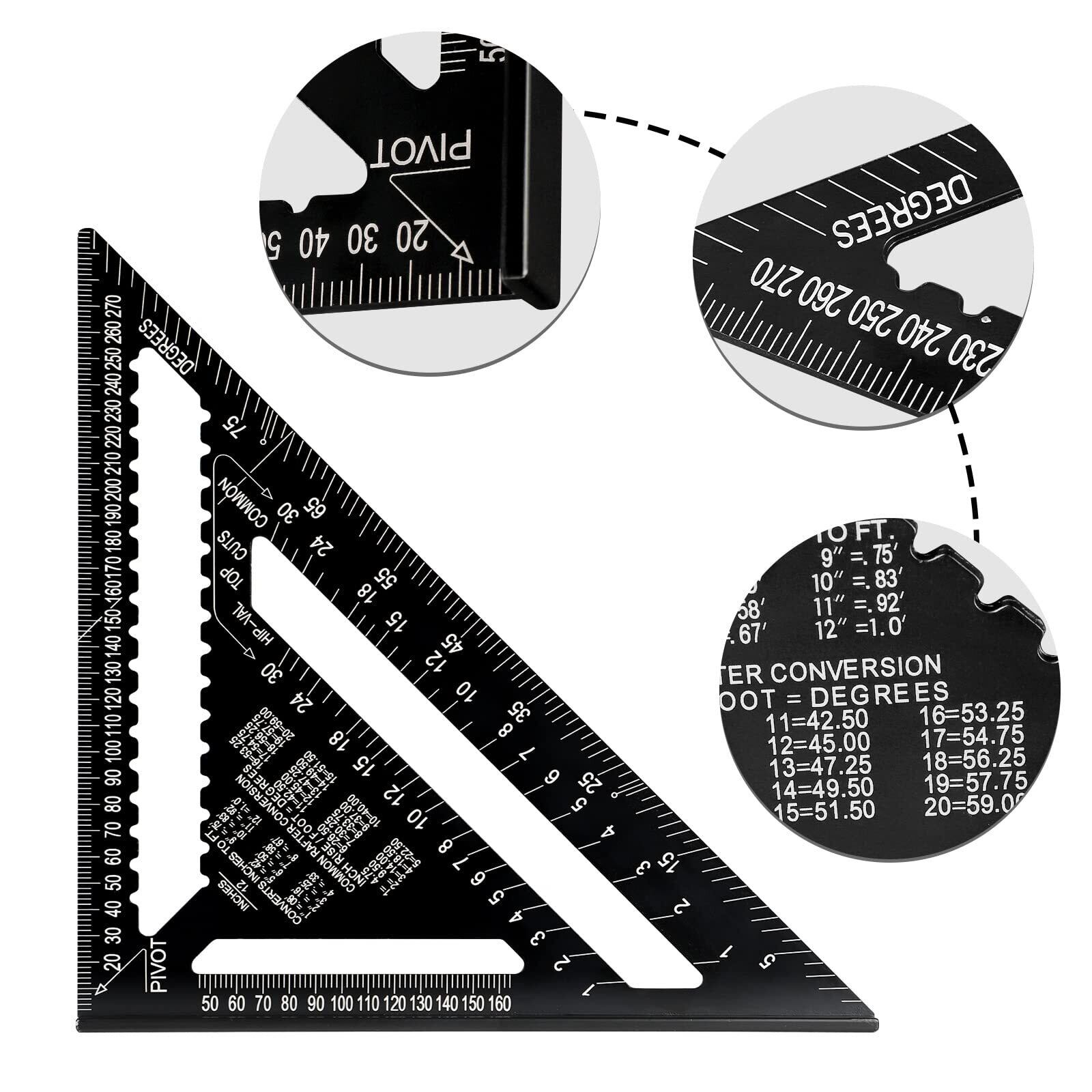1.本体サイズ:約30*30cm、目盛:2mm。黒い三角尺には白い目盛りが表記され、数字や度数を読むのに便利です。