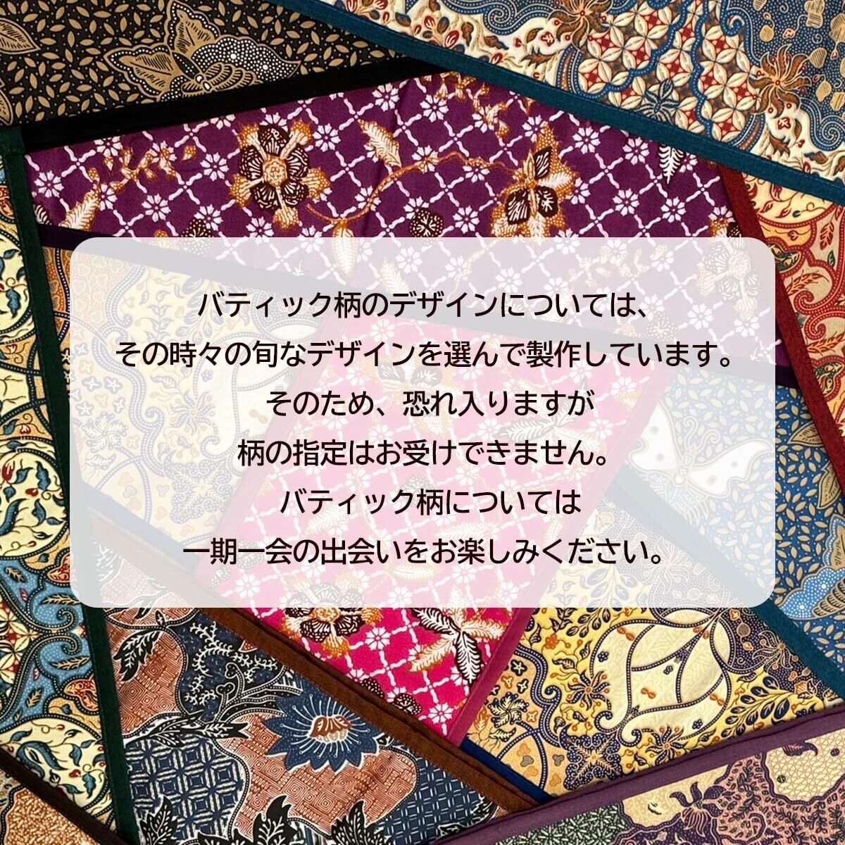 背面の無地のカラーは表記の通りです。表面のバティック布は、掲載の柄と違うデザインの柄が届く場合もございます。あらかじめご了承ください。