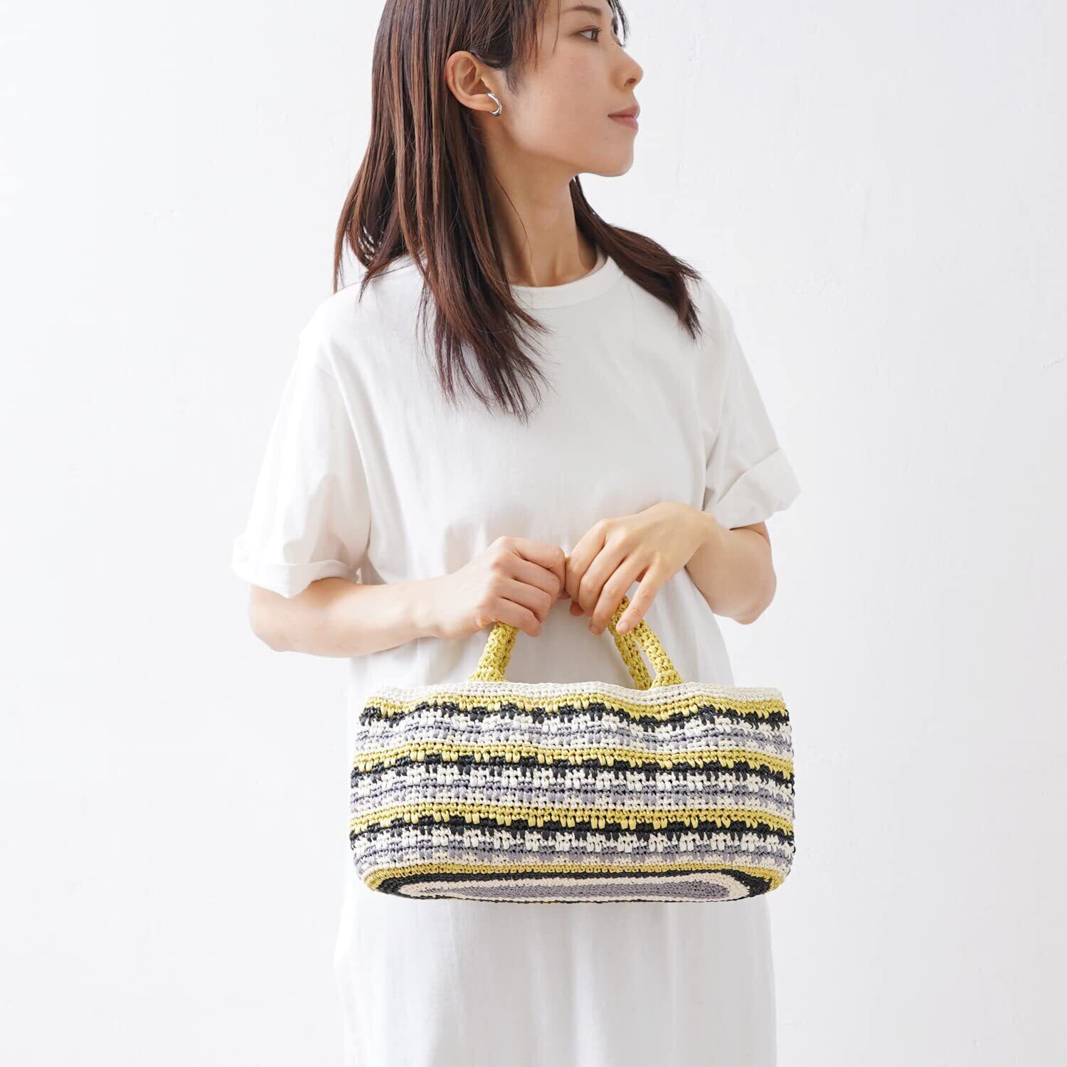 キット内容 ・毛糸:毛糸:ペーパーヤーン/ホワイト(11)…2玉、イエロー(5)…2玉、グレー(12)…1玉、ブラック(13)…1玉 ・マグネットホック(18mm)1組 ・レシピ…1枚(※基本的な編み方の解説は入っていません。)