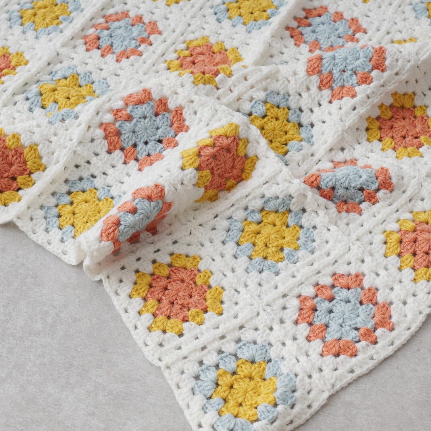 基本のグラニースクエアモチーフを、配色してつなげただけのシンプルなおくるみです。