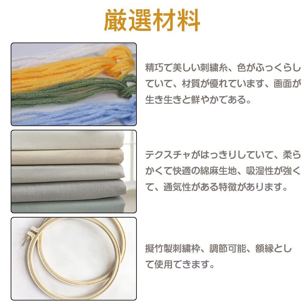 【原材料】テクスチャがはっきりしていて、柔らかくて快適の綿麻生地、吸湿性が強くて、通気性がある特徴があります。精巧で美しい刺繍糸、色がふっくらしていて、材質が優れています。調節可能な刺繍枠、額縁として使用することができます。