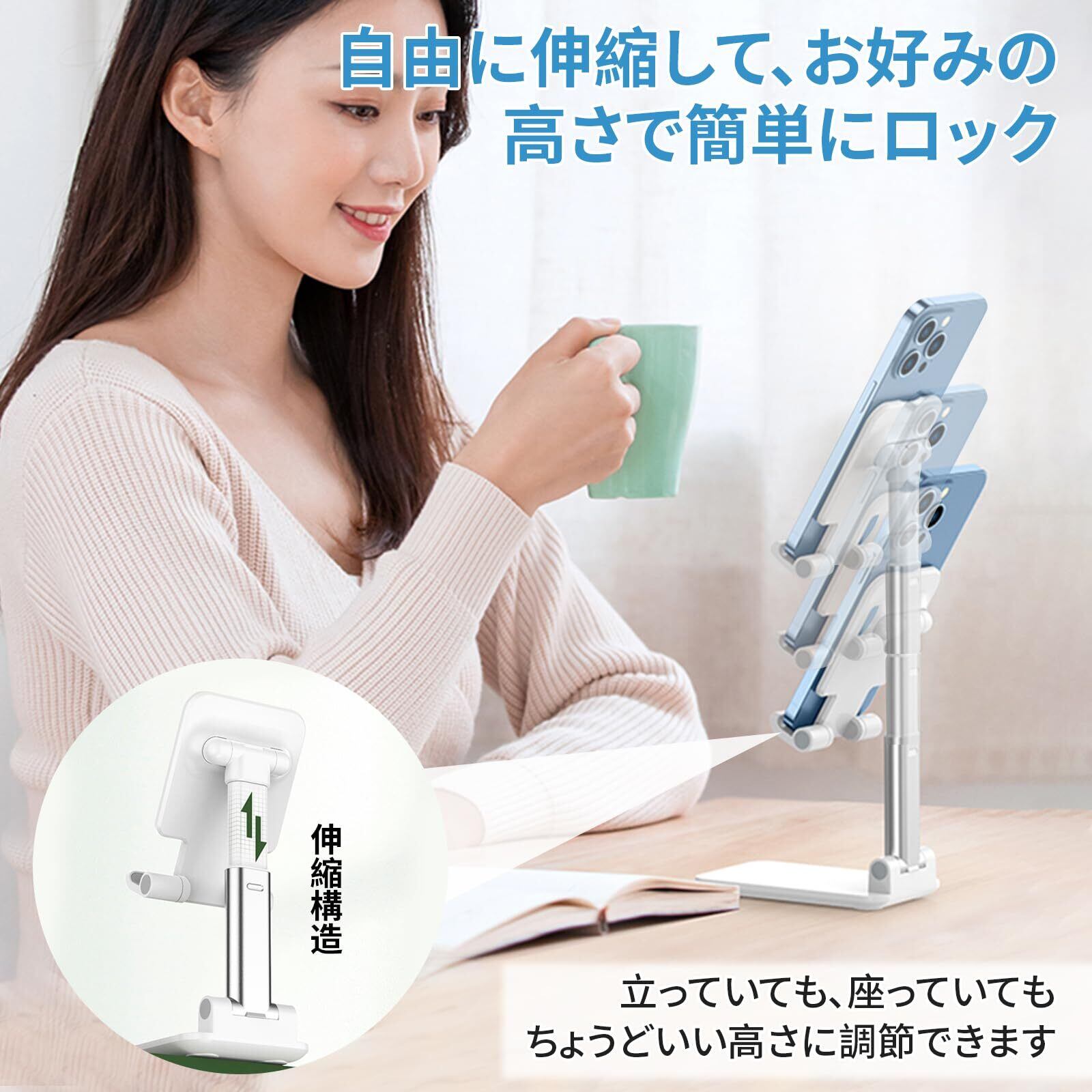 【新春セール】スマホスタンド 折り畳み 卓上 角度調節 高さ調節可能 滑り止め 厚底デザイン 安定性 折りたたみ コンパクト タブレット iPhoneスマホ 対応 携帯スタンド 動画鑑賞 ビデオ通話 生放送 Web会議などに活用 (ホワイト)