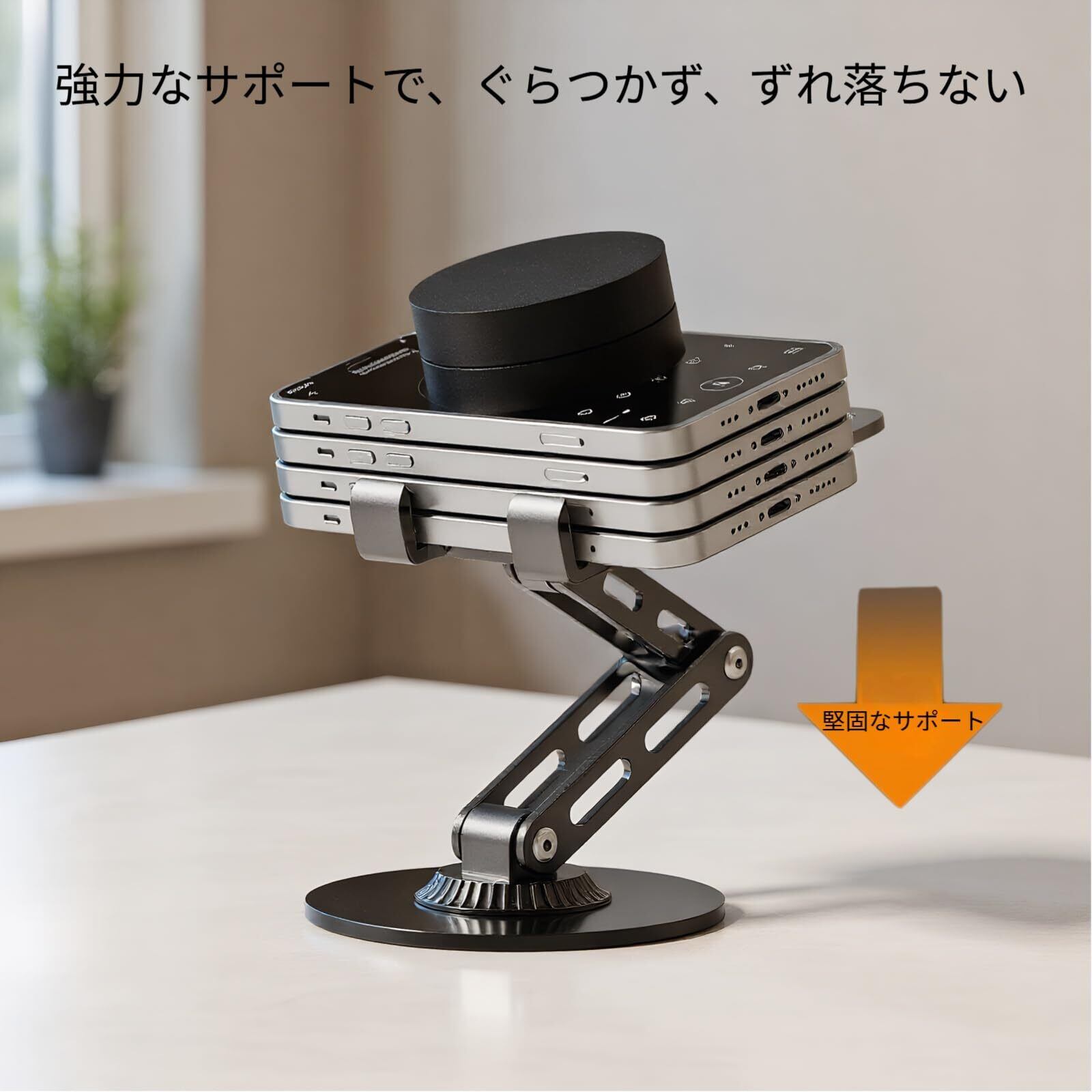 360度全方向回転&高さ自由調整 スマホを縦向き・横向きに360度回転させられ、高さも簡単に調整可能。オフィスでの作業、自宅での映画視聴、ライブ配信、自撮りなど、あらゆるシーンに最適です。