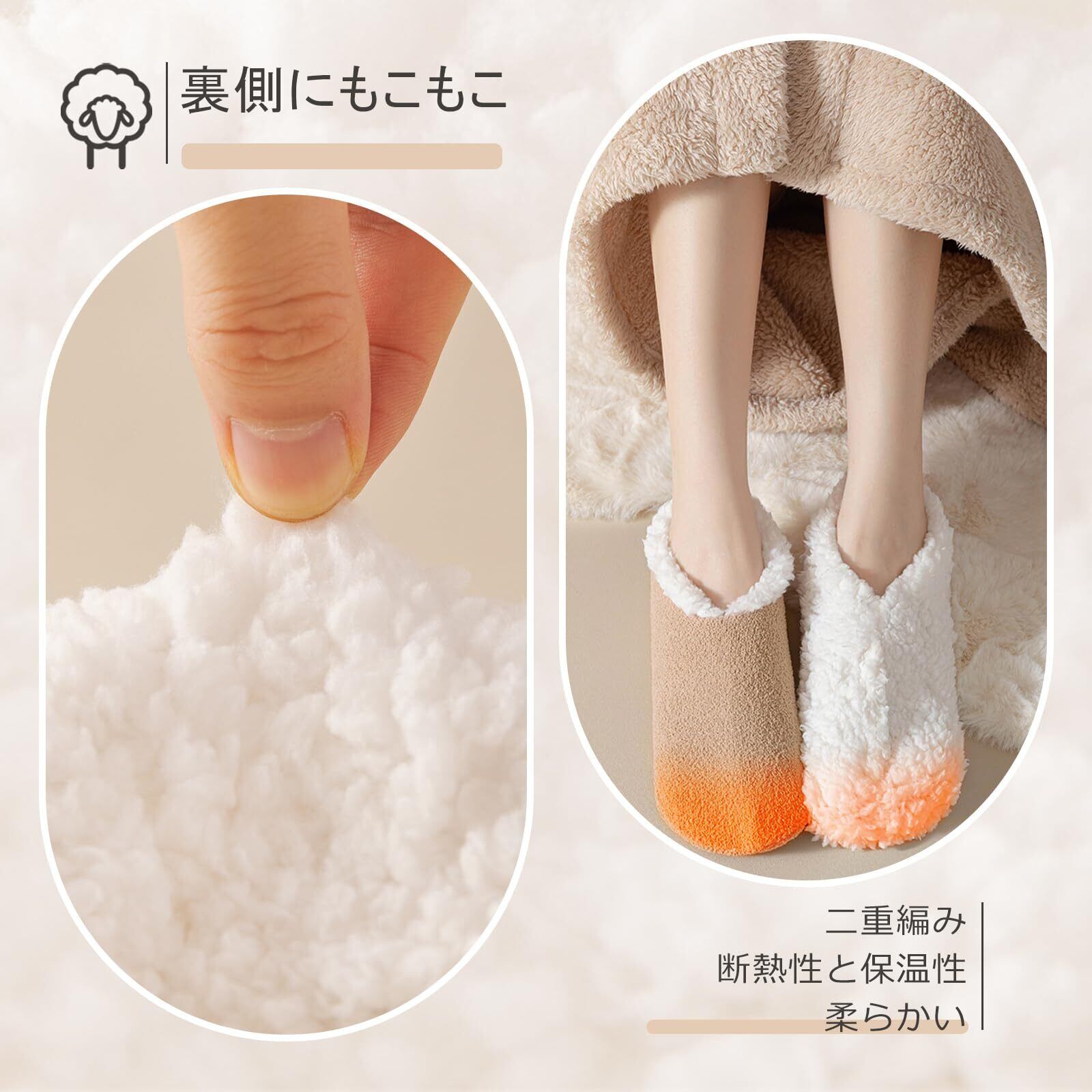 【おしゃれ 使用便利】:可愛くてシンプルなデザインは年齢別問わず履けます。優れた品質で肌触りよいです。足先から履き口までもこもこの裏ボア付き、まるで毛布に包まれているような履き心地、しっかり蓄え保温します。裏側のもこもこデザインでやわらかくて保温性も高いですので冬に適しています。軽い素材なので、持ち運びにも便利もこもこ靴下。
