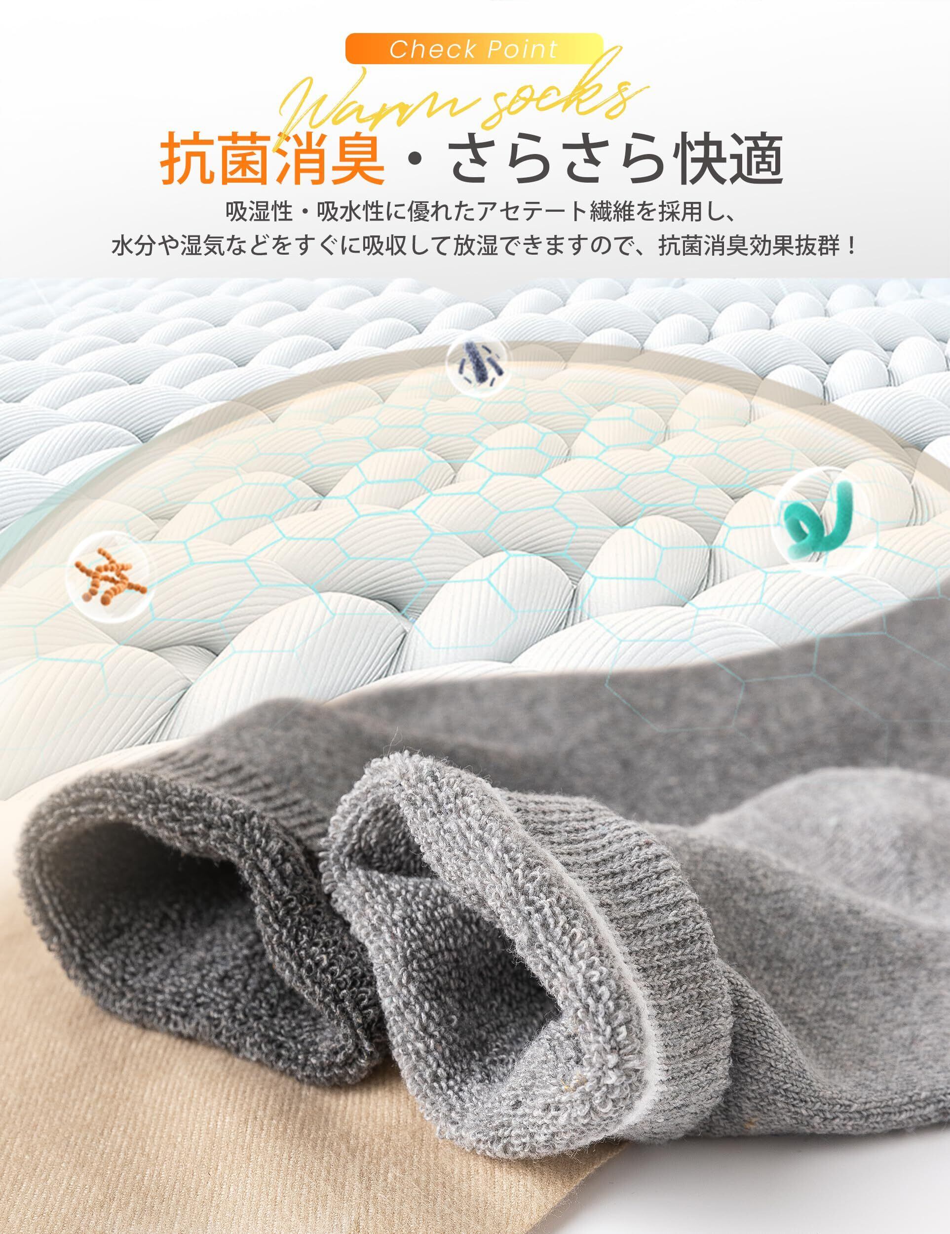 【抗菌・消臭靴下 レディース】レディース冬靴下のメーン素材として、アセテート繊維は吸湿性・吸水性に優れた特徴を持ちます。水分や湿気などをすぐに吸収して放湿できますので、抗菌消臭効果抜群!それに、厚手靴下にウール素材も入り、異なる素材の組み合わせにより、通気性と保温性を同時に叶えてくれます。SLEEPSINERO吸湿消臭靴下を装着してスポーツや作業をしても、一日中蒸れずにあたたかく過ごします!