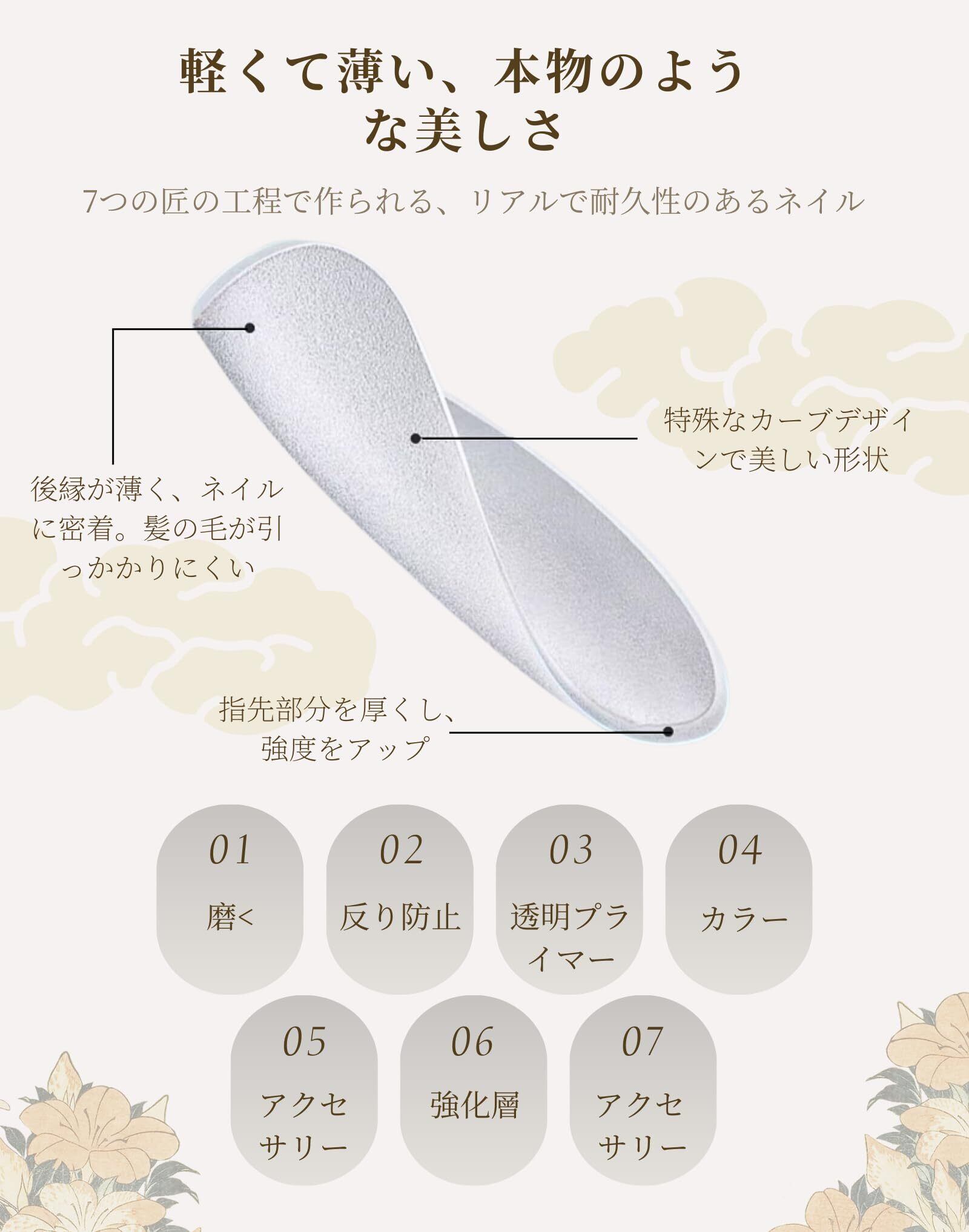 リアルなネイルアート 機械製の使い捨てネイルとは異なり、LemiVibeのネイルは極薄のシミュレーションネイルを使用。7工程のネイルアートで、サロン級の仕上がりを実現。繰り返し使える高品質ネイルです。