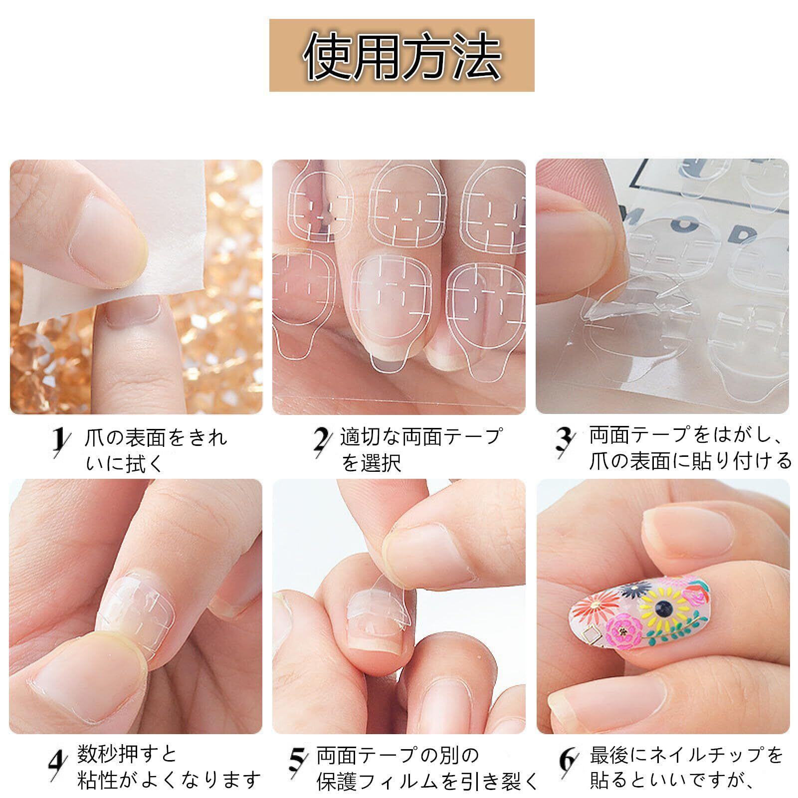 つけ爪 ネイルチップは、付属の美甲用両面テープ(ジェルテープ)とネイルグルー(爪用接着剤)の 2 種類で固定できます。ジェルテープを使用する場合は、通常 3 日程度美しい状態を維持でき、取り外し時には本爪を傷めることなく簡単に剥がせるため、ネイルチップを複数回繰り返し使用できます。長期間同じデザインを楽しみたい場合は、ネイルグルーを使用することでさらに長持ちさせることも可能です。素材の耐久性も優れているため、繰り返し使用しても破れたり割れたりしにくく、経済的に美甲を楽しみたい方に最適な商品です。