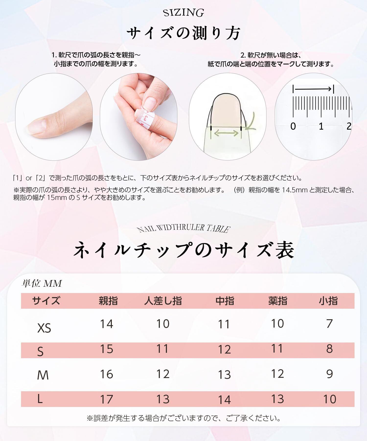 【ネイルチップの使い方】~取り付け方法~1:爪磨きを使用して爪の表面を磨き、凹凸がない滑らかな状態にします。2:付属のクリーナー等で爪表面と手指を拭き取り、清潔で乾いた状態にしてください。3:粘着テープ全体のシートを開き、それぞれの爪のサイズに合う粘着シールを選びます。粘着テープ上のシートつまみを持ち、シールを台紙から剥がして自爪の根元に合わせながら真っすぐ置いて貼り付けていきます。(※空気が入らないよう、指で空気を外に押し出すようにして、 隙間なくピッタリ貼り付けることが大切です。)4:爪に貼った粘着テープ上のつまみを持ってフィルムを剥がします。ネイルチップの根元部分を、甘皮より1~2mm上の位置に斜めに貼り、空気を抜きながら甘皮の方向へ押し込むようにして装着します。5:数秒間ネイルチップを指で抑えて、しっかり密着させます。(STEP4~5を全ての爪に繰返し行ってください。)