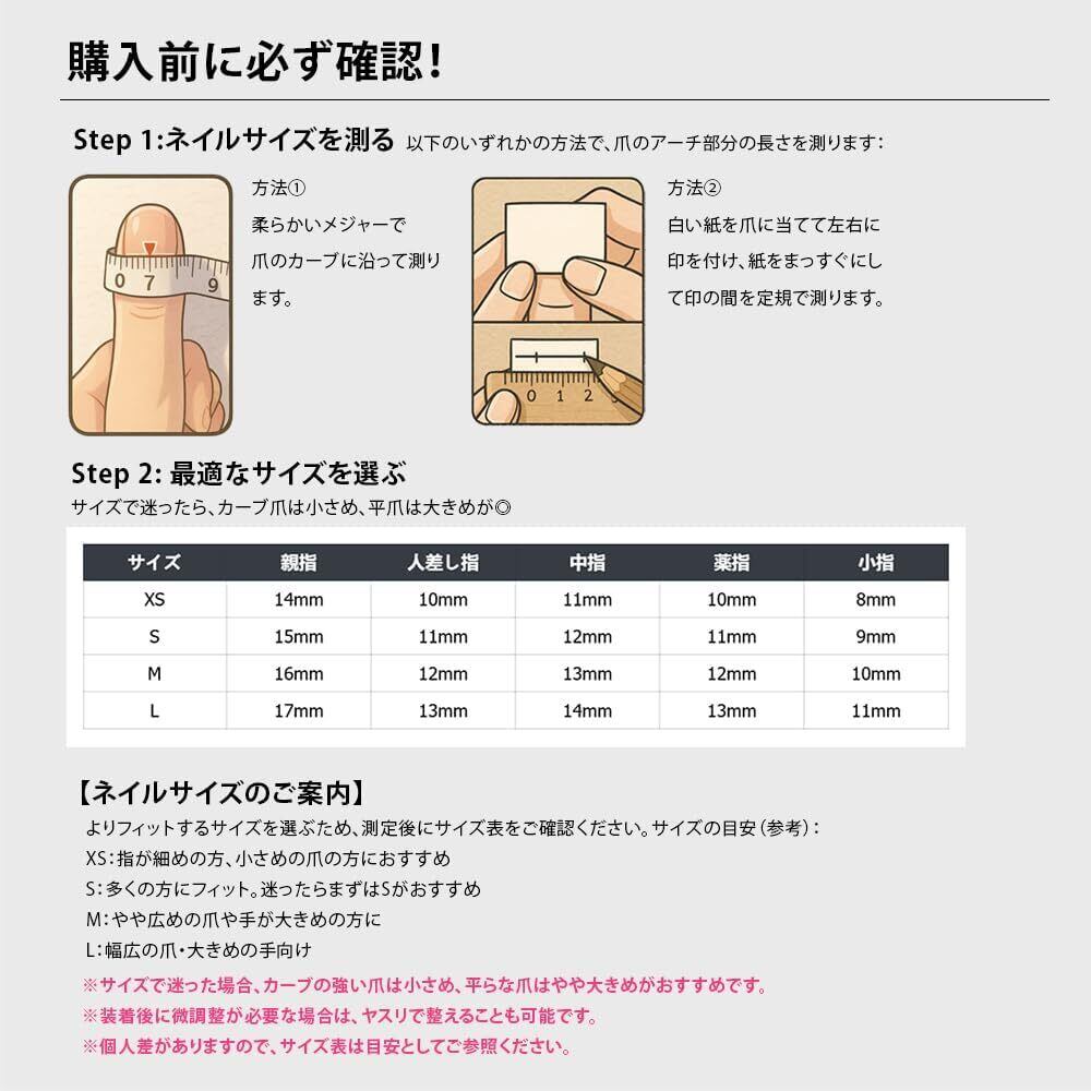 「ネイルサロンレベルのセット、サイズ選びも重要」 セット内容:ネイルチップ10枚、ジェルシール2枚、ネイルファイル1本、ウッドスティック1本。 【ご注意事項】 ご購入前にサイズをご確認の上、最適なフィット感を確保し、快適で自然な装着感をお楽しみください。 それぞれ手作りのため、実物と写真には若干の違いがございますので、ご了承ください。 ジェルパッドとツールセットはパッケージの底に収納してありますので、ご確認ください。