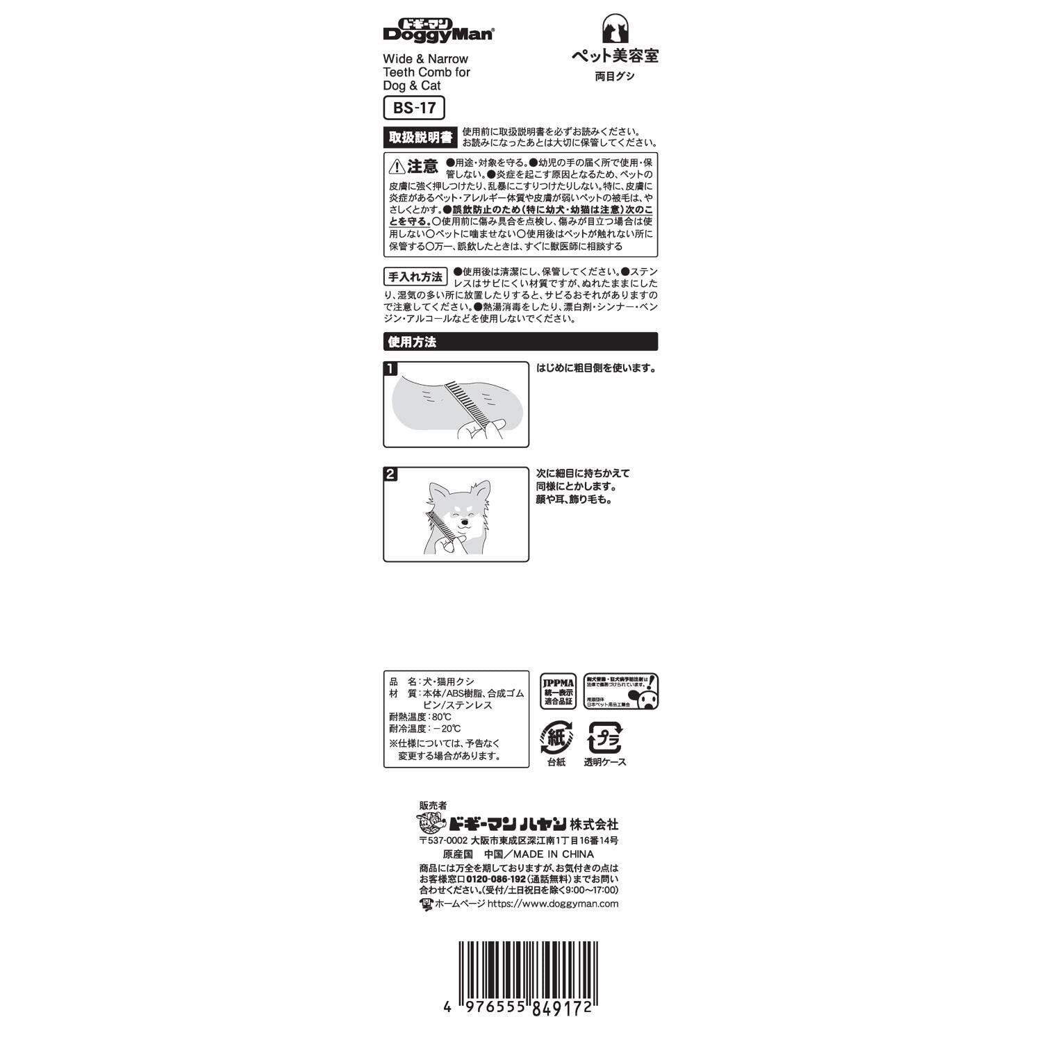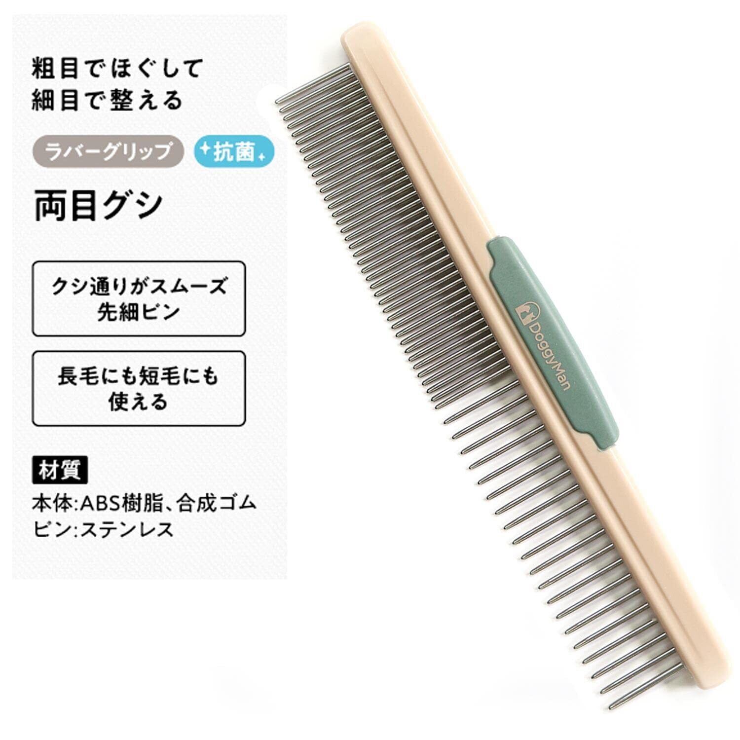 ●粗目でほぐして細目で整える。この1本でできる便利なクシ。●長毛、短毛。犬ちゃん、猫ちゃん、みんなに使えるベーシックなクシ。●毎日のお手入れに重宝する両目クシ。●クシ通りがスムーズなステンレス製先丸ピンを使用。●ドギーマンのペット美容室。犬猫用。ラバーグリップ・抗菌。耐熱温度:80℃耐冷温度:-20℃。