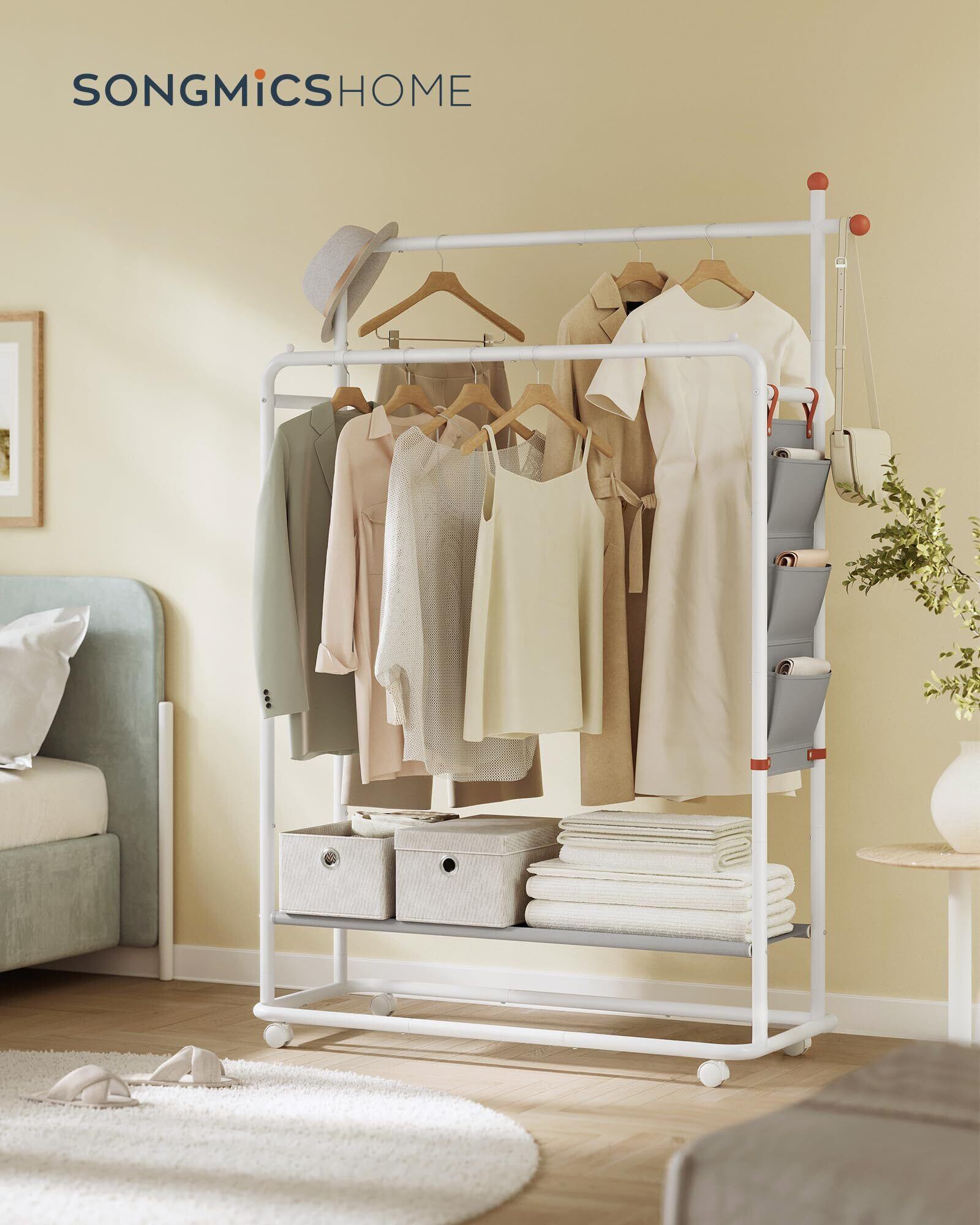 SONGMICS HOME ハンガーラック 2段 頑丈 衣装ラック 洋服・コード掛けパイプハンガー 棚 キャスター付き 幅103cm 衣類収納 安定性 移動しやすい ちょうどいいサイズ 室内物干し ホワイト HSR171W01