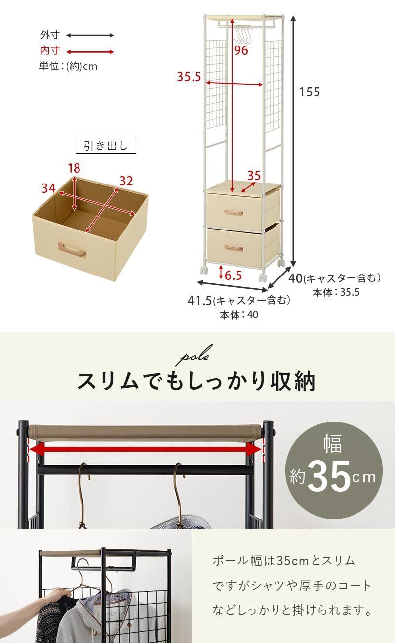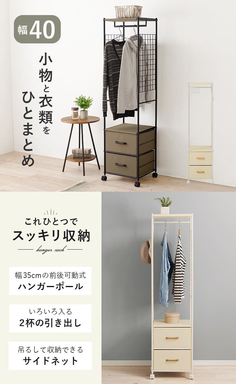 萩原 ハンガーラック 引き出し付き 2杯 幅40 キャスター付き 【動かせるポール】 頑丈 収納 押し入れ 棚付き ホワイト KHR-3186WH