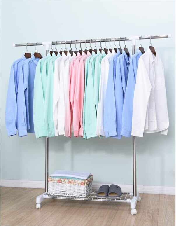 使いやすいシンプルなデザイン:清潔感のある爽やかな色合いのシングルタイプのパイプハンガー。 シンプルなデザインだからどんなお部屋にも馴染みやすい。 収納目安:Yシャツなら約20着、ジャケットなら約15着収納可能。