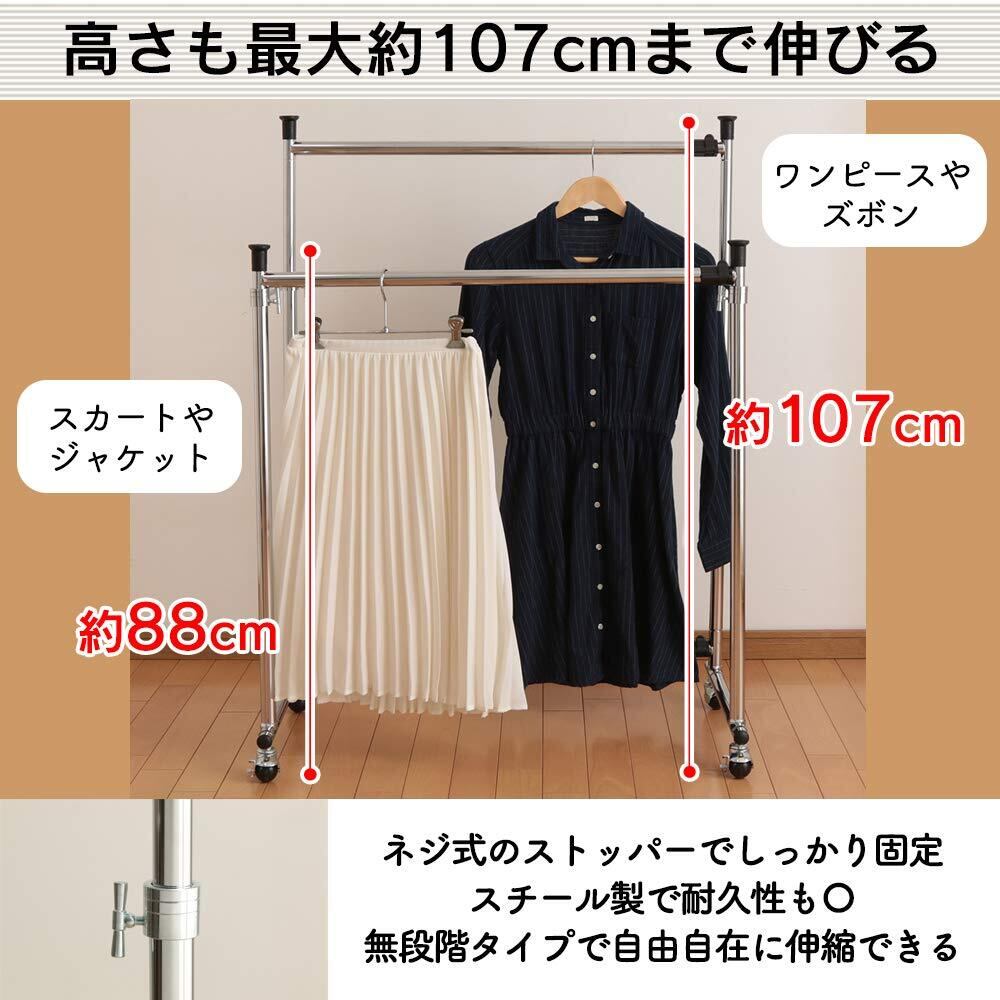 スペースや収納する衣類の量によって幅と高さを変えられる伸縮タイプ。