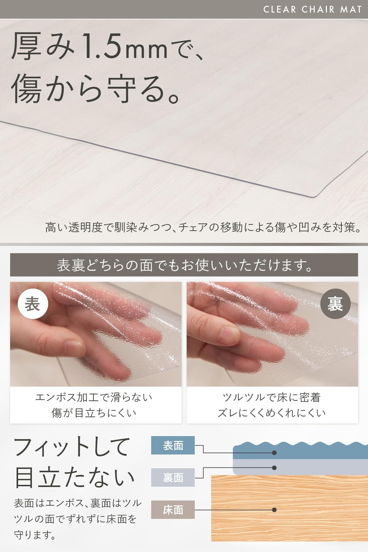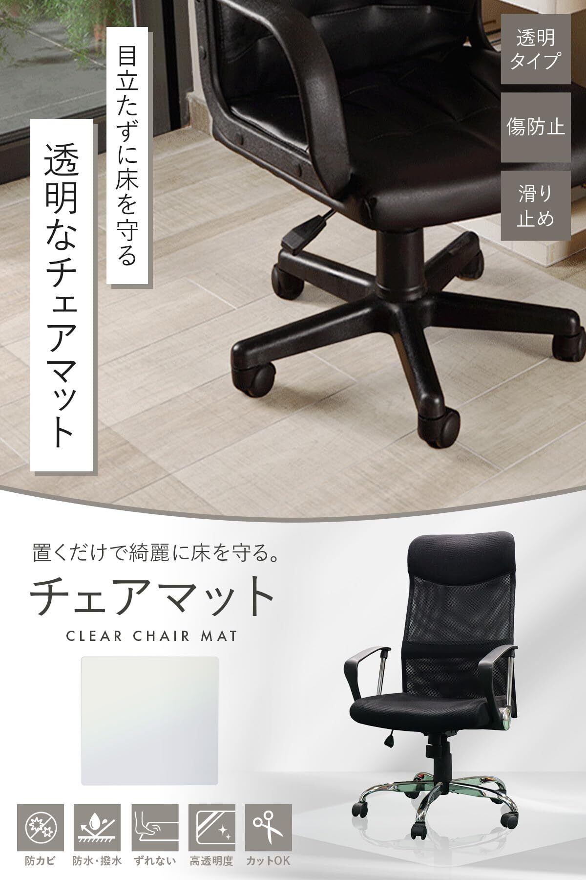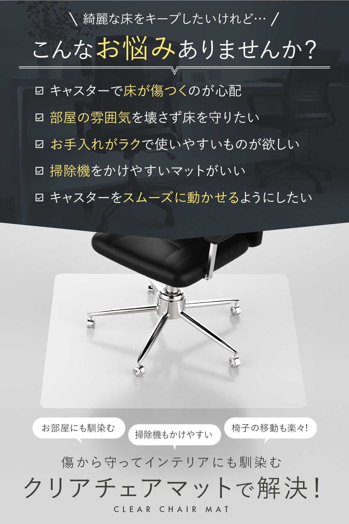 【フローリングをしっかりガード】 椅子のキャスターによるキズや凹みから床を守る透明チェアマットです。フローリングや畳の保護に最適で、賃貸でも安心して使用できます。