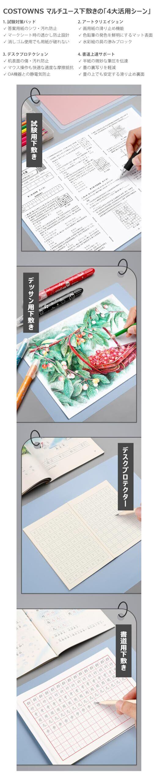 3. マルチユース設計 ・学習用:消しゴム跡が付きにくい特殊表面 ・業務用:カーボン複写時のズレ防止 ・クリエイティブ:色鉛筆の発色を鮮明にするマット加工