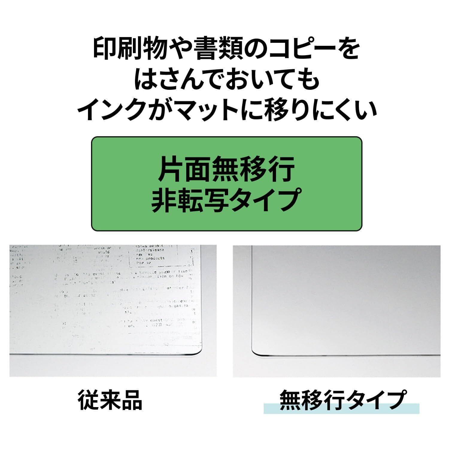 印刷物や書類のコピーを長期間挟んでおいてもインクがマットに移りにくい加工を施した片面無移行タイプ。