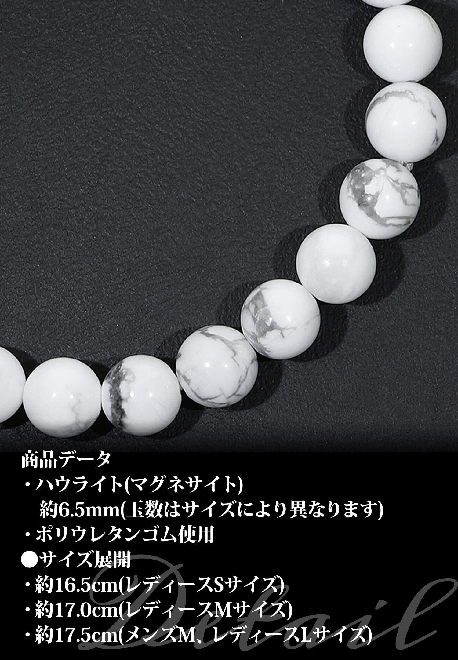 商品データ・商品番号 [HOM-B01]・ハウライト(マグネサイト) 約6.5mm(玉数はサイズにより異なります)・ポリウレタンゴム使用●サイズ展開・約16.5cm(レディースSサイズ)・約17.0cm(レディースMサイズ)・約17.5cm(メンズM、レディースLサイズ)