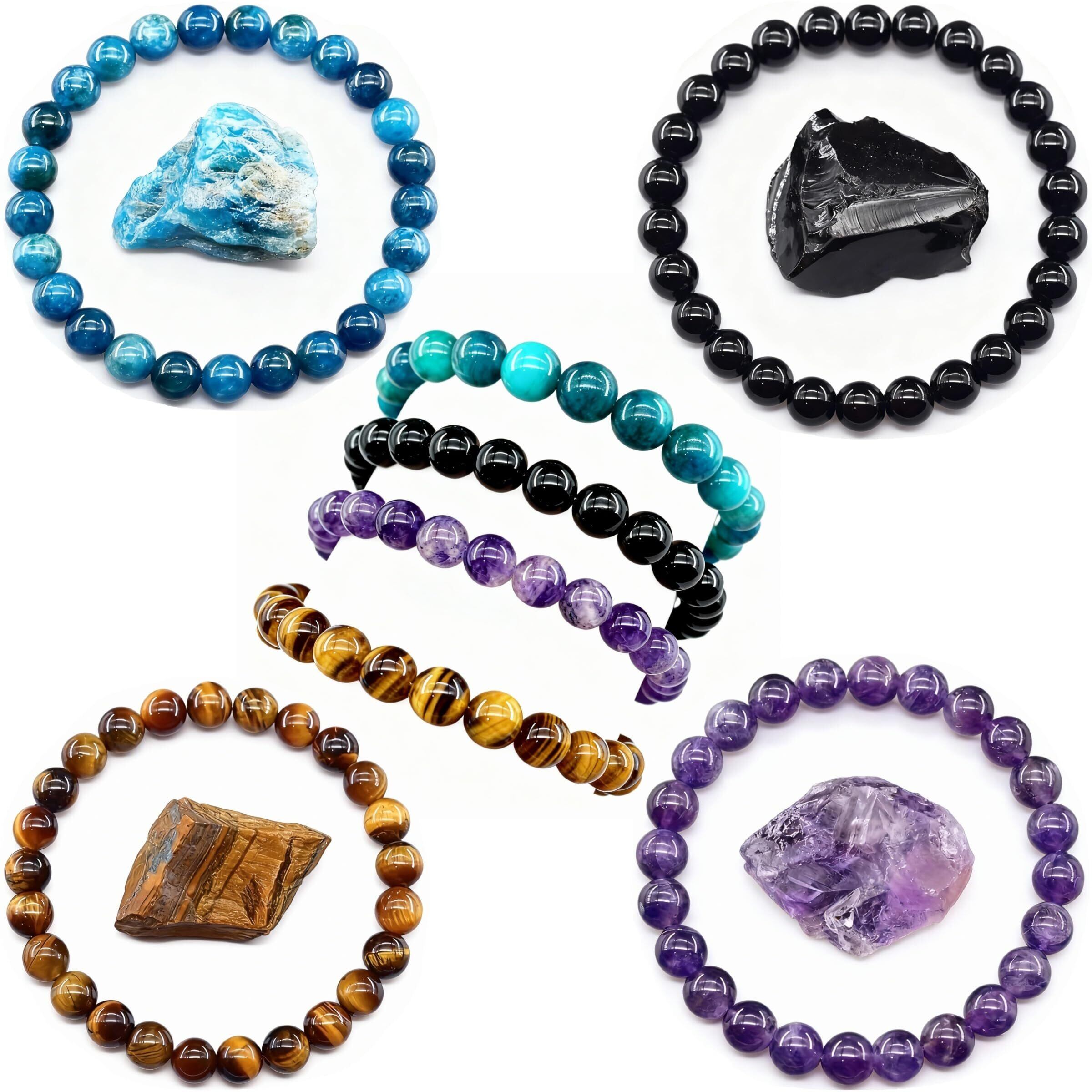 【1. 4本セットの天然石ブレスレット】 8mmの天然石ビーズを使用した、4本セットのブレスレットです。アメジスト、タイガーアイ、ラピスラズリ、ローズクォーツなど、パワーストーンとして人気の石を厳選。毎日のコーディネートやギフトに最適です。